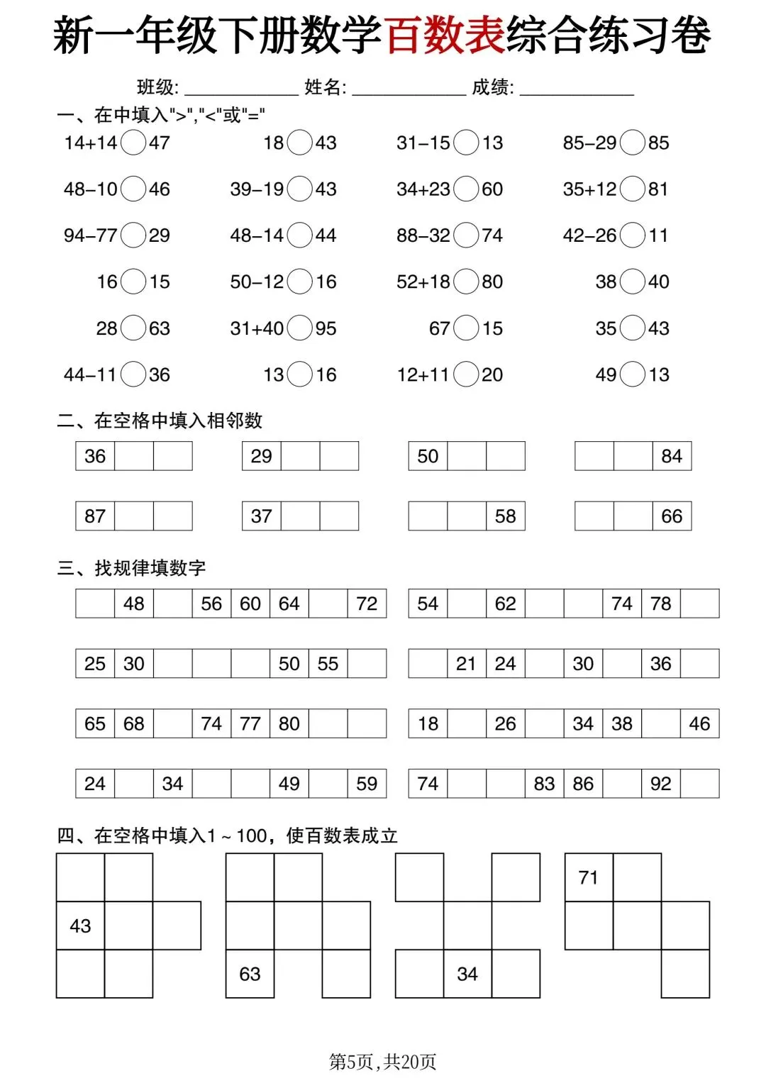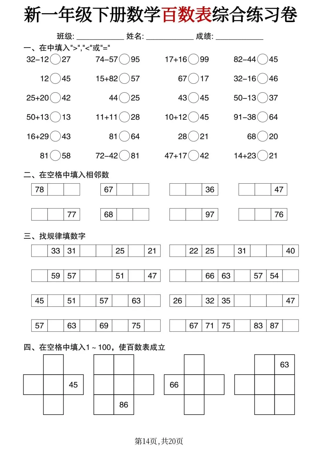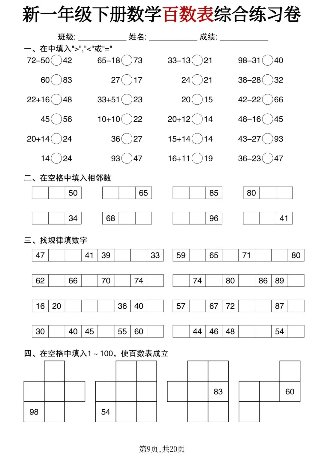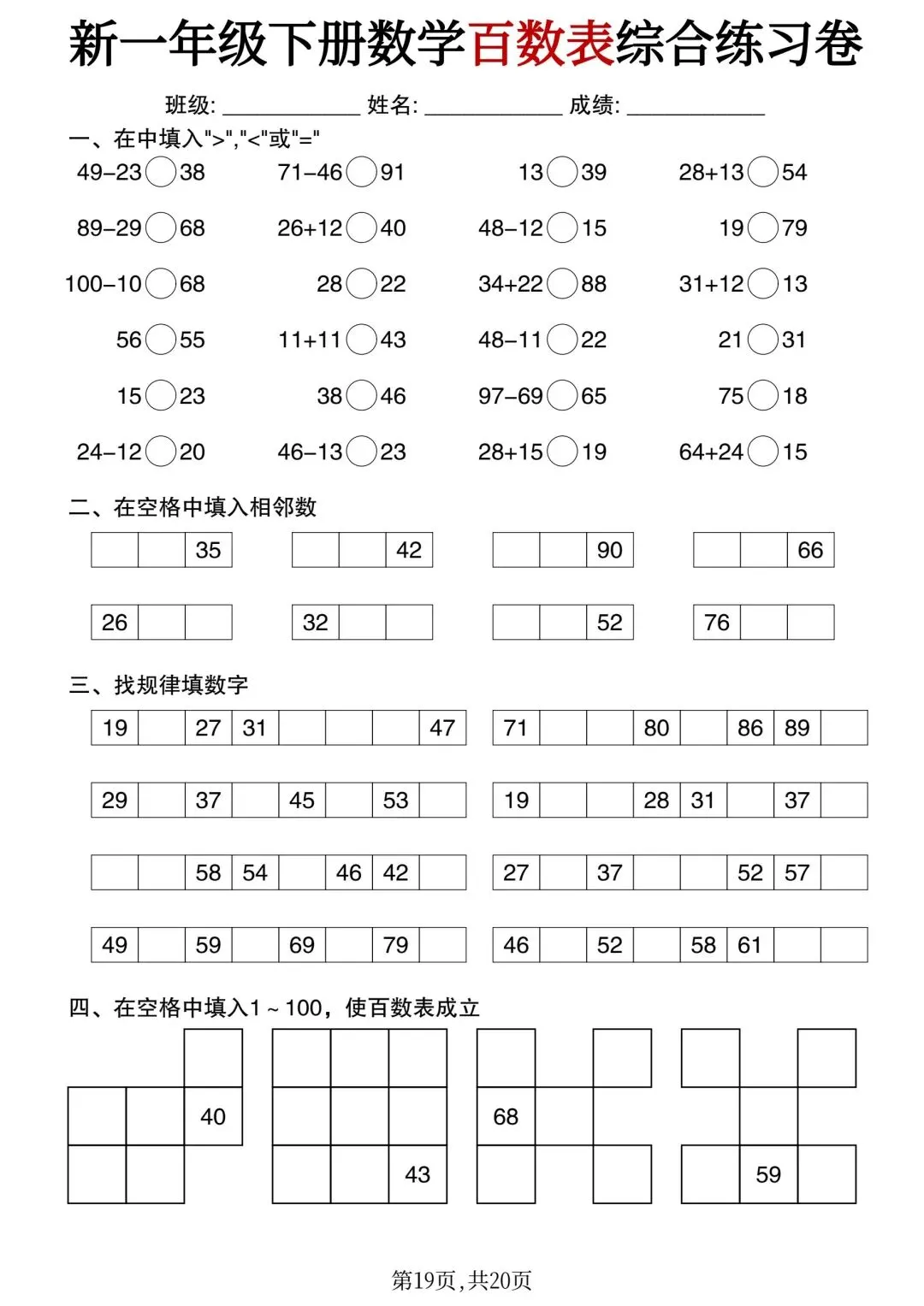 一年级(下)数学百数表综合练习卷,电子版可下载免费