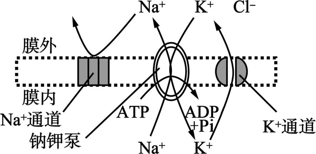 生物膜对无机离子的跨膜运输有被动运输(顺离子浓度梯度)和主动运输(逆离子浓度梯度)两种方式。被动运输的通道称离子通道,主动运输的离子载体称为离子泵。如下图所示: