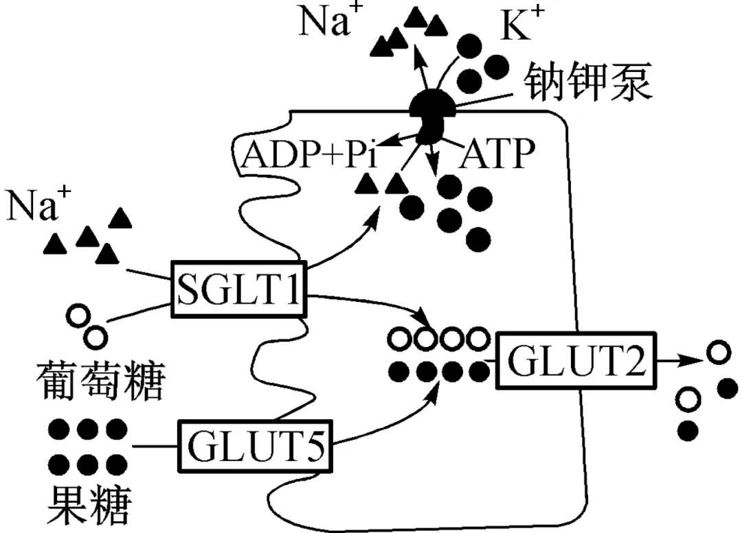 下图中钠钾泵、GLUT2、GLUT5、SGLT1分别代表载体,其中GLUT5属于单一运输载体,只能专一性运载果糖。钠钾泵、GLUT2、SGLT1能运输两种物质,属于协同运输载体,其中SGLT1、GLUT2属于同向协同运输载体,钠钾泵属于反向协同运输载体。