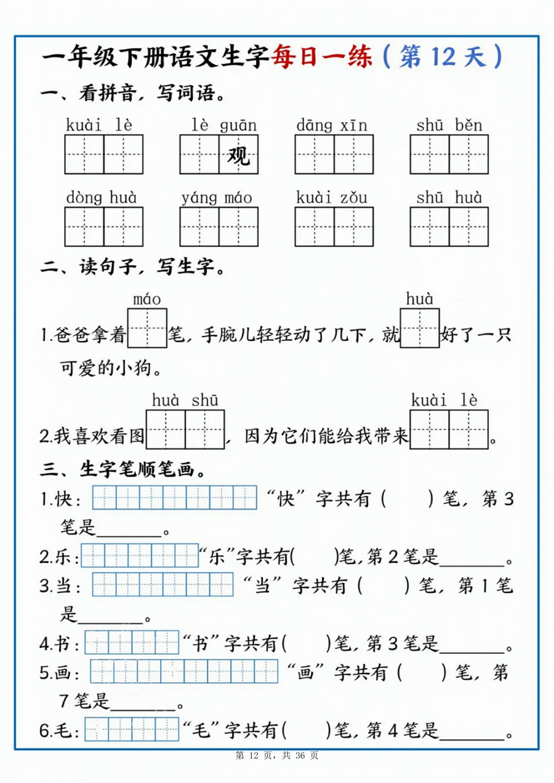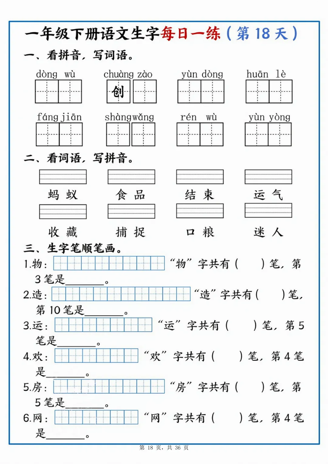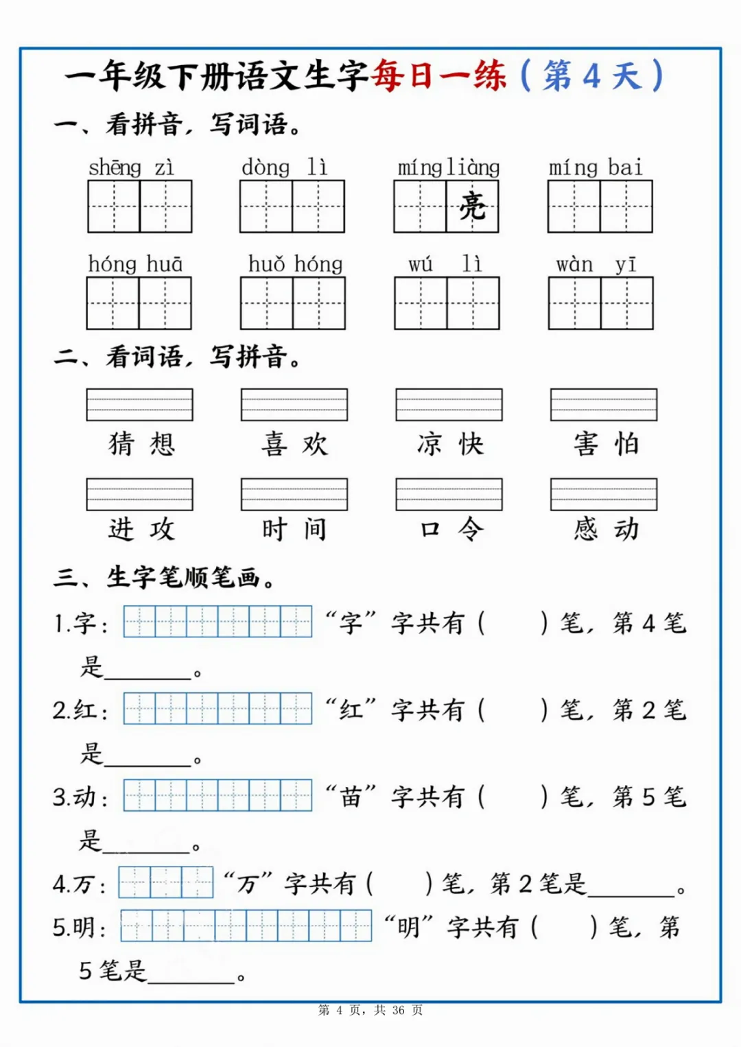 今天给大家分享的是:【一年级下册语文】【通用版】26新语文生字每日一练共36天|完整高清电子版可打印