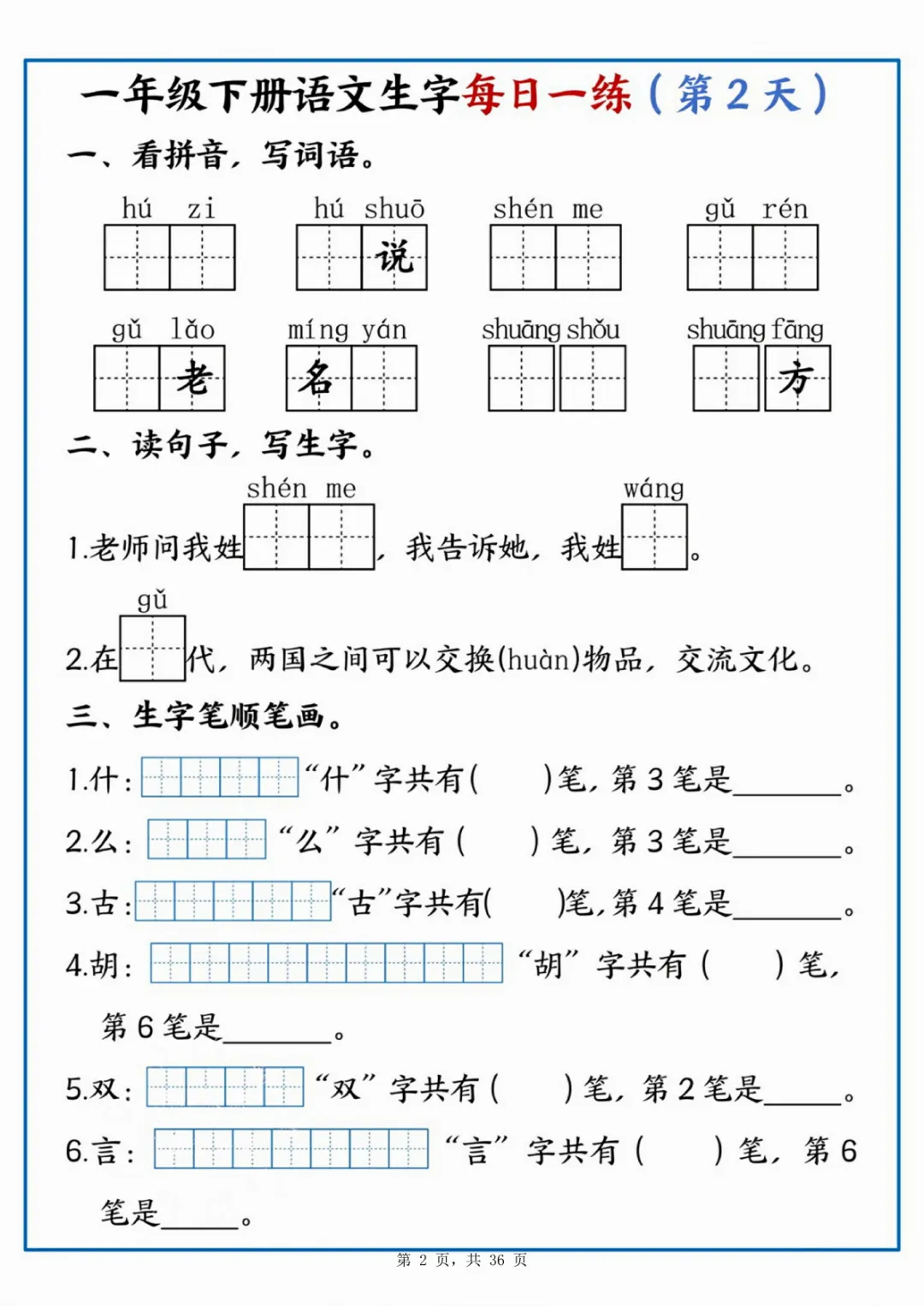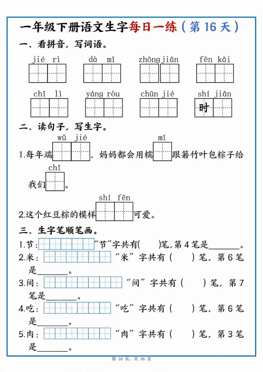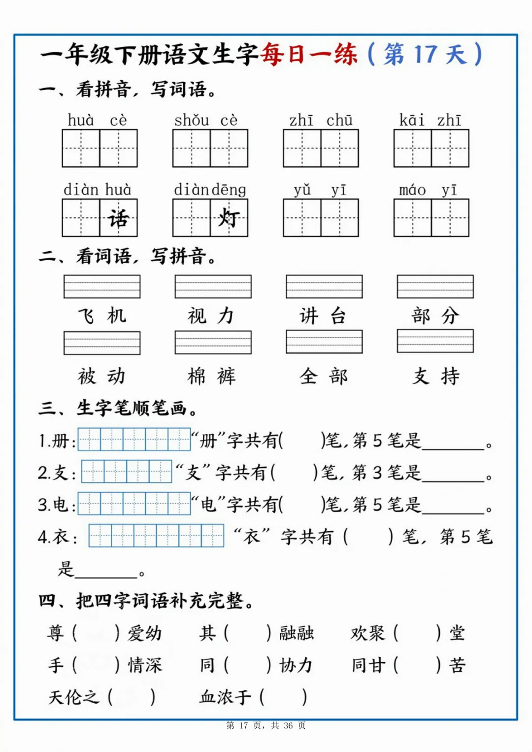 今天给大家分享的是:【一年级下册语文】【通用版】26新语文生字每日一练共36天|完整高清电子版可打印