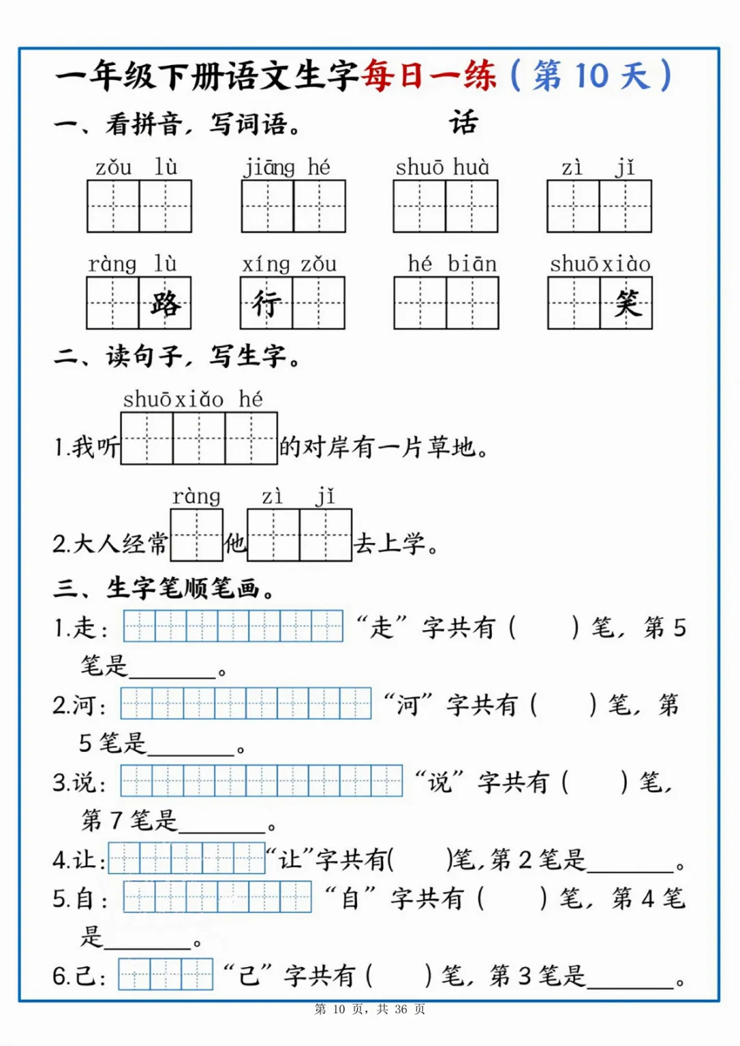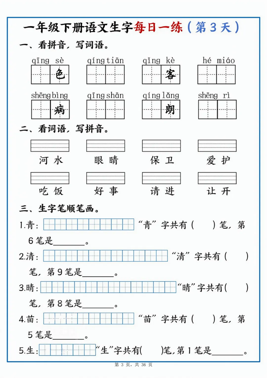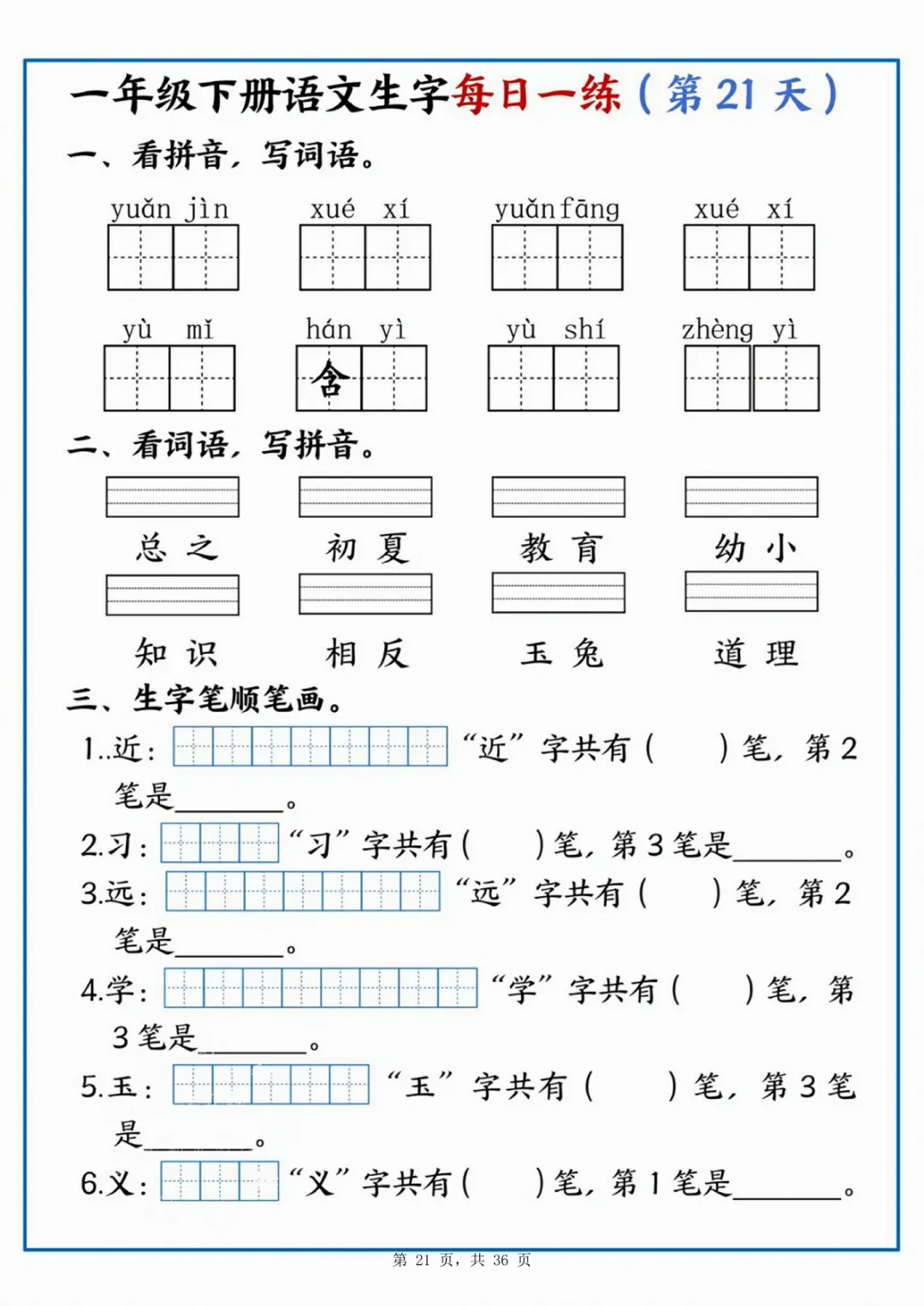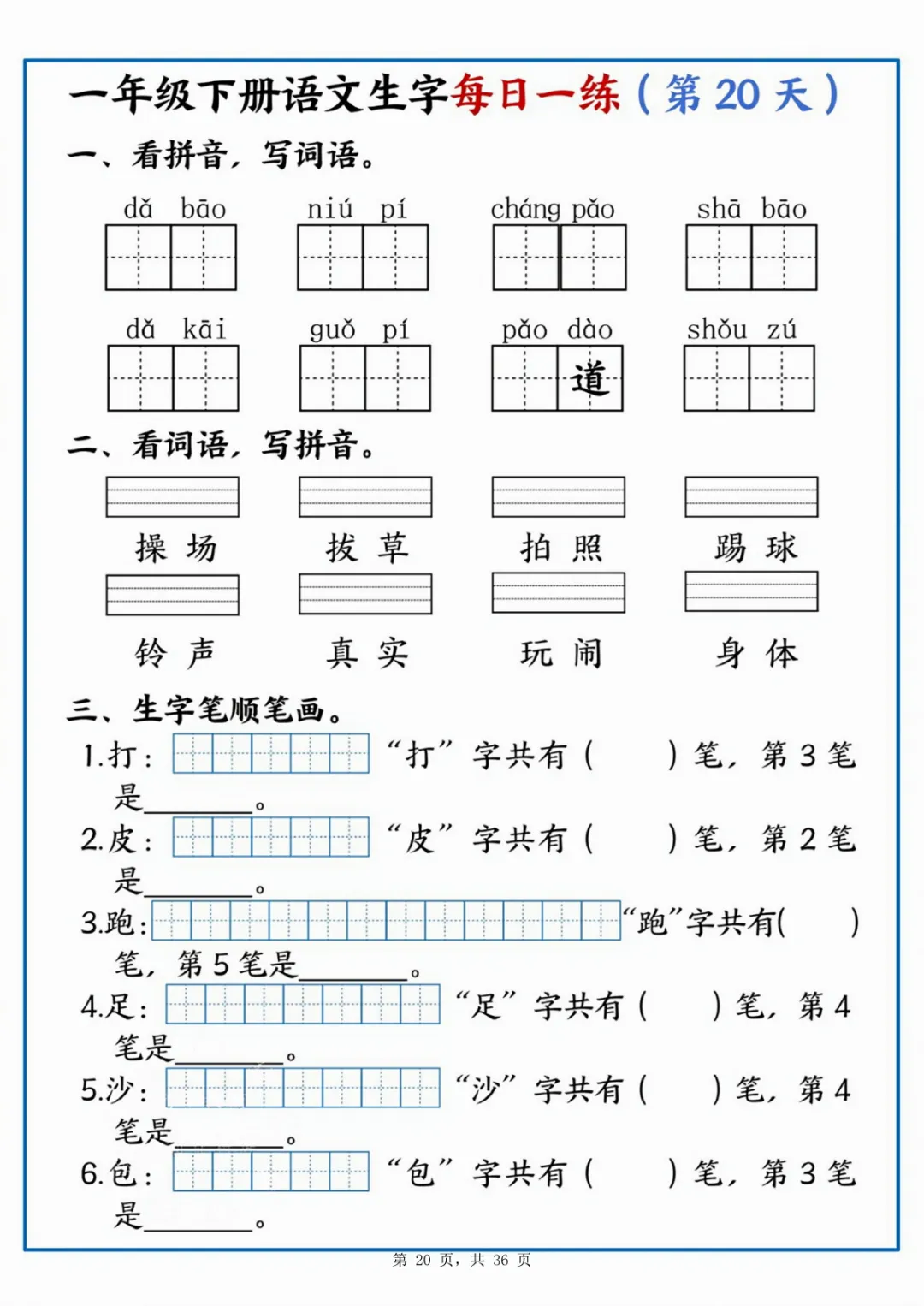 【一年级下册语文】【通用版】26新语文生字每日一练共36天|完整高清可打印