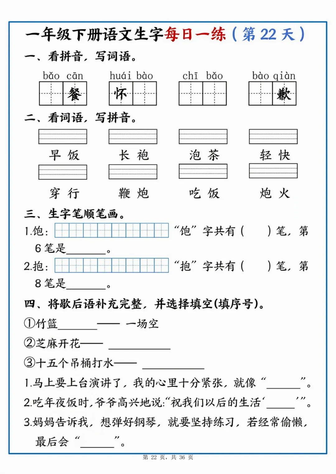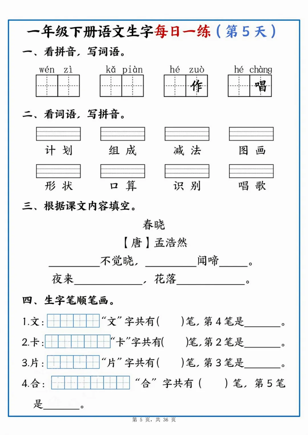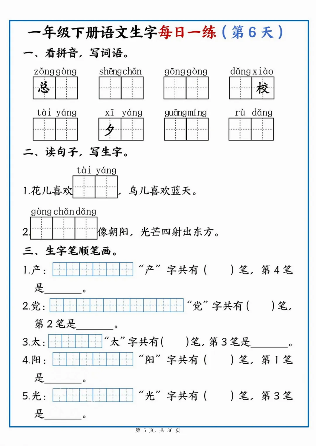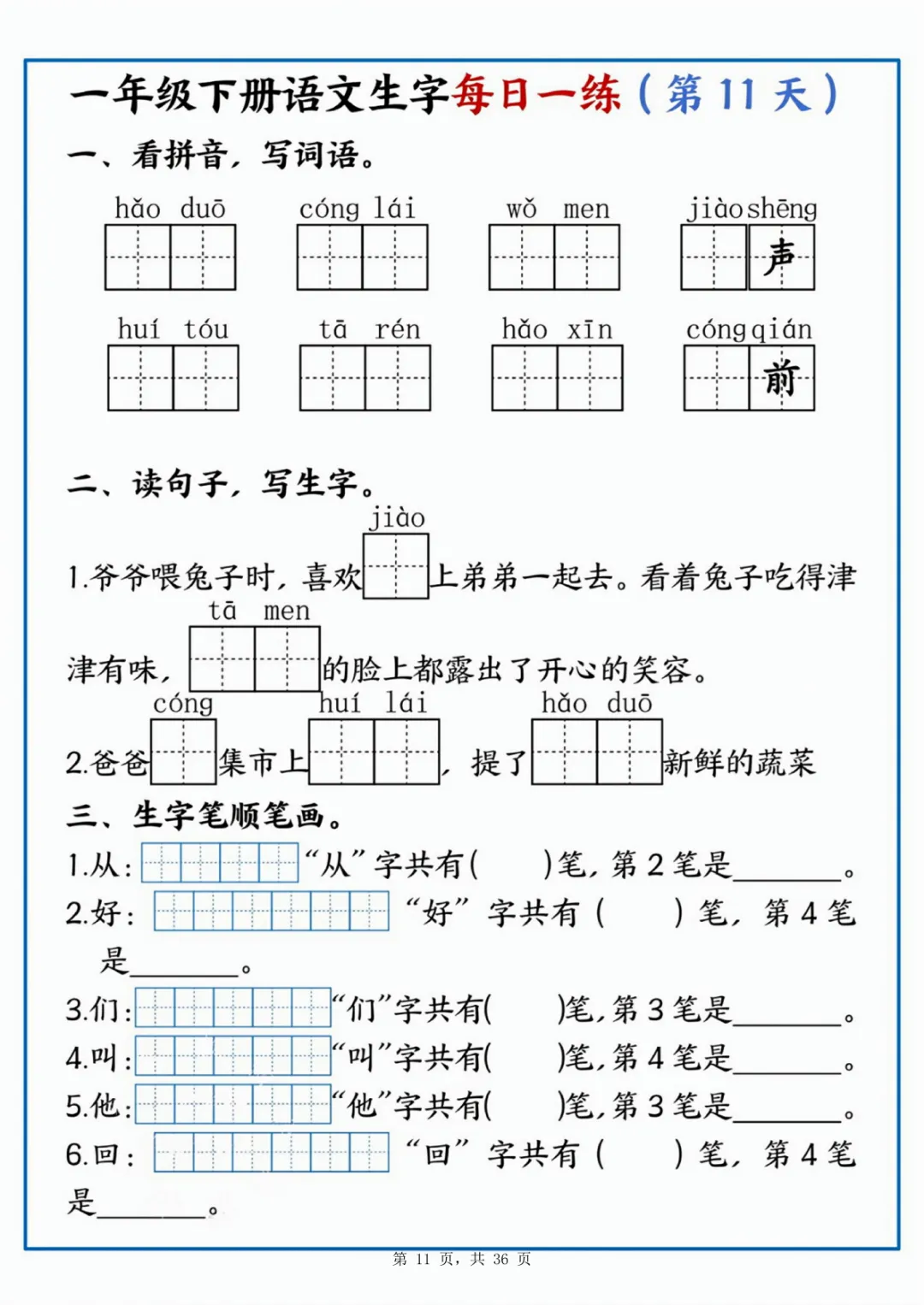【一年级下册语文】【通用版】26新语文生字每日一练共36天|完整高清可打印