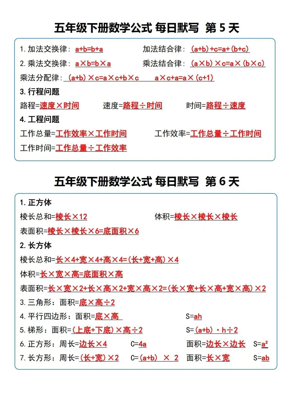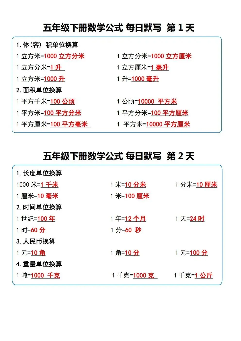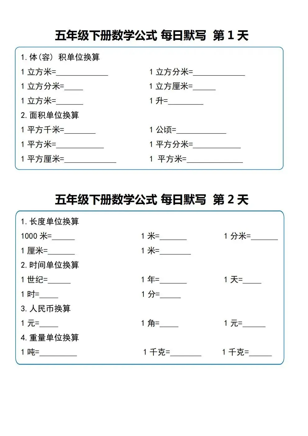 🌸《26春最新数学课内重点知识晨读晚默》紧扣人教版五年级下册教材,涵盖单位换算、体积面积、倍数因数、立体图形公式及经典应用题模型。设公式版与填空版,兼顾理解与记忆。每日10分钟,巩固基础,提升准确率。高清版本直接打印方便孩子学习!