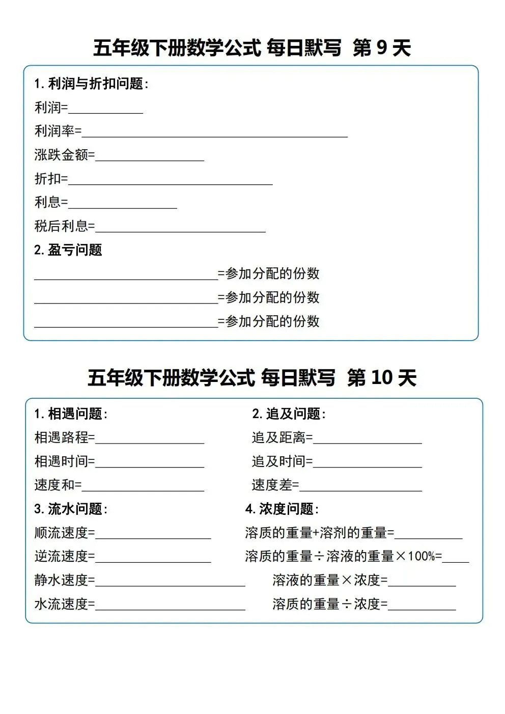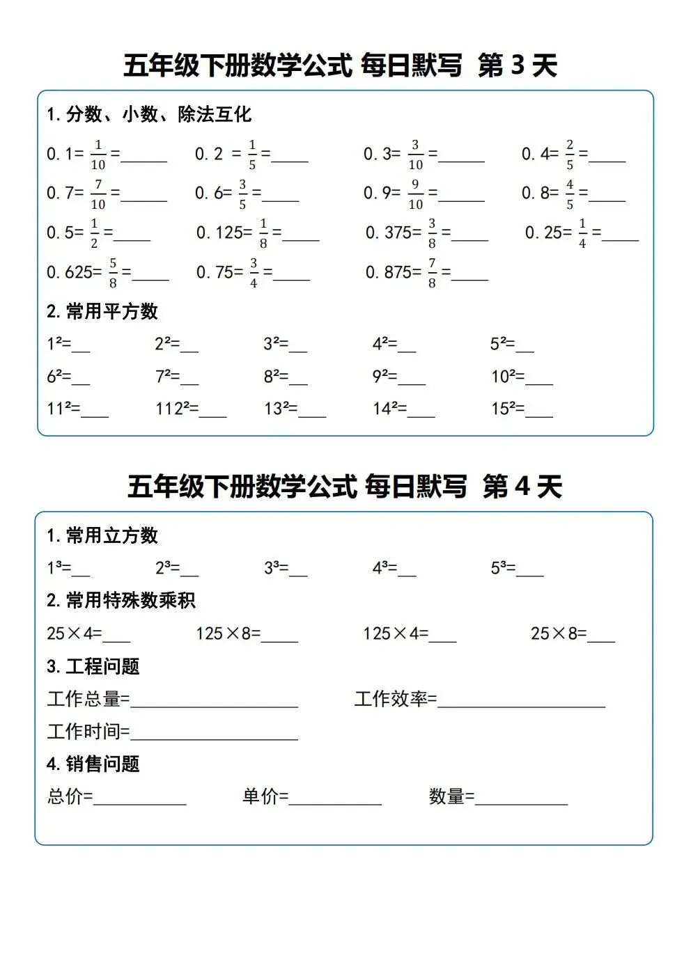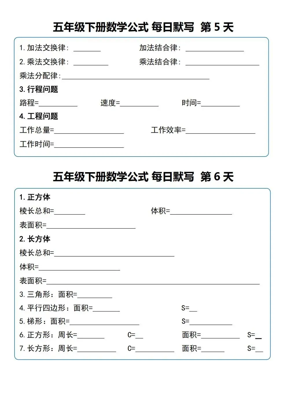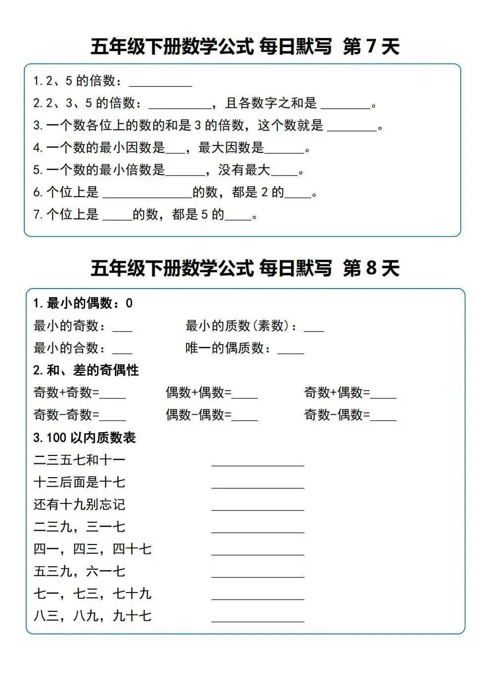 🌸《26春最新数学课内重点知识晨读晚默》紧扣人教版五年级下册教材,涵盖单位换算、体积面积、倍数因数、立体图形公式及经典应用题模型。设公式版与填空版,兼顾理解与记忆。每日10分钟,巩固基础,提升准确率。高清版本直接打印方便孩子学习!