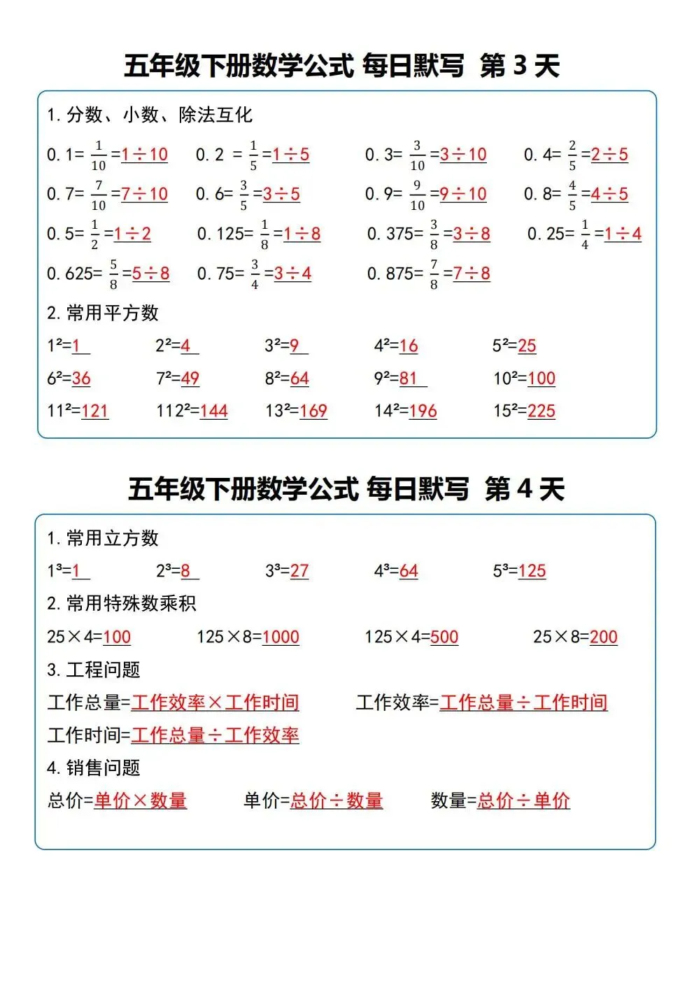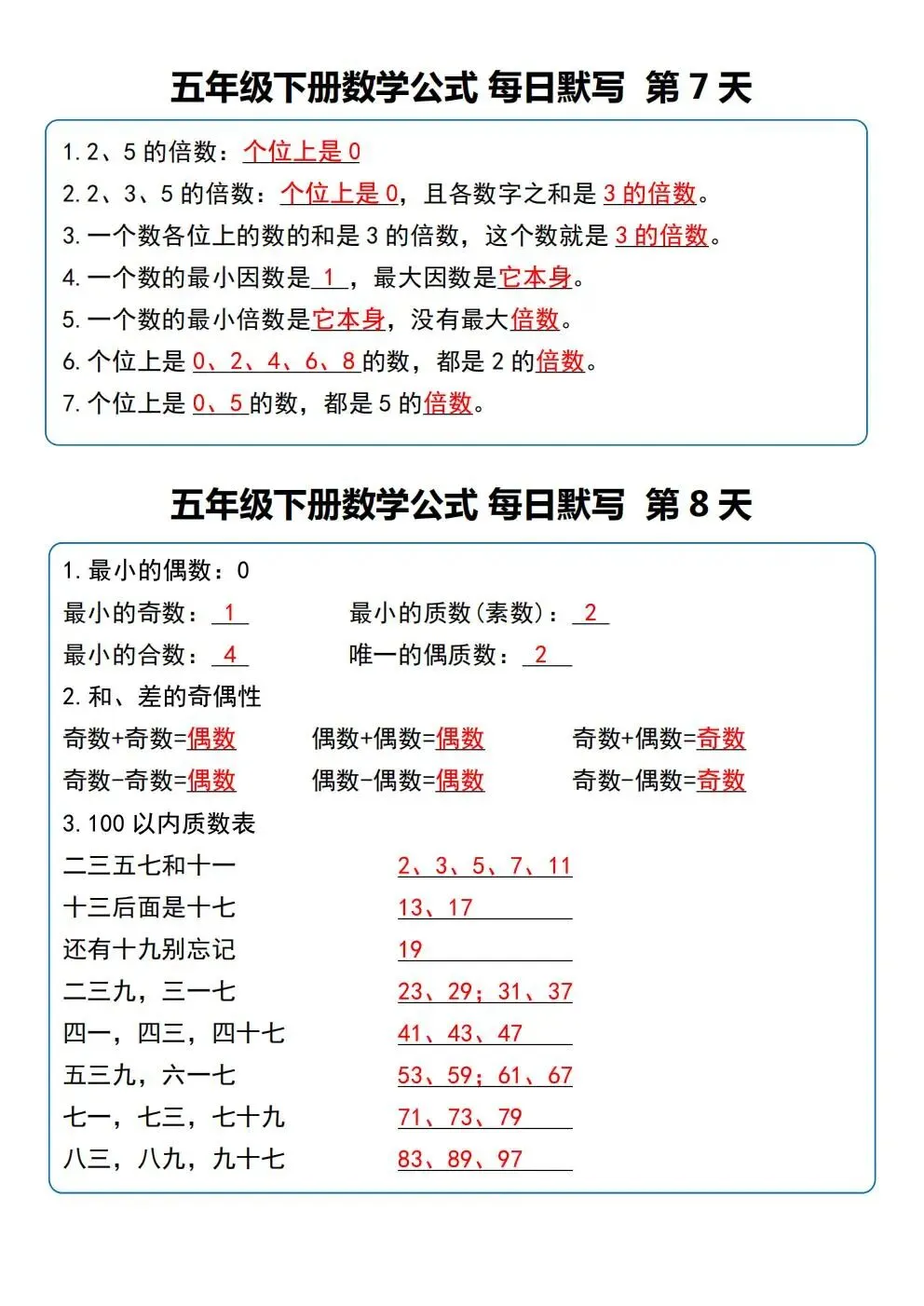 26春最新版五年级下册数学《课内重点知识晨读晚默(晨读单+默写单)》,完整可打印