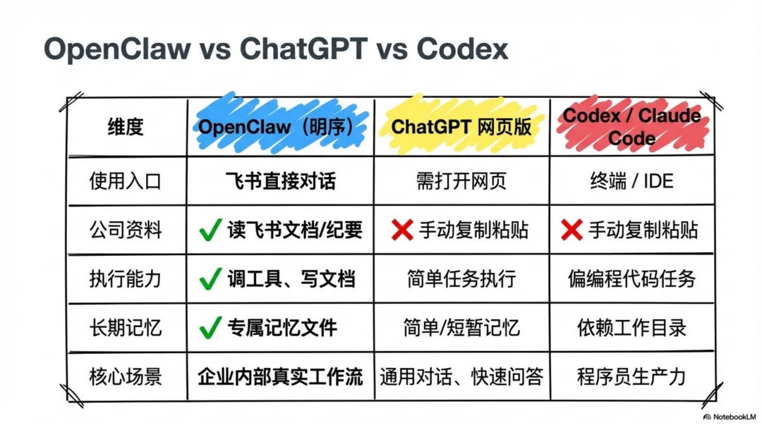 这个定义包含了两个至关重要的核心特性,正是这两个特性,将它与我们所熟知的 ChatGPT 网页版、Codex 等工具彻底区别开来。