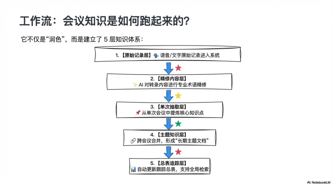 创造的价值:这套流程彻底改变了我们对待会议记录的方式。它不再是一次性的沟通记录,而是成为了一个持续增长、可检索、可复用的动态知识库。新员工可以通过阅读这些主题文档,快速了解一个项目的技术演进历史;研发团队在开启新课题时,可以迅速回顾历史上相关的决策和踩过的坑,避免重复劳动。知识,真正地开始在组织内部沉淀、流动和增值。