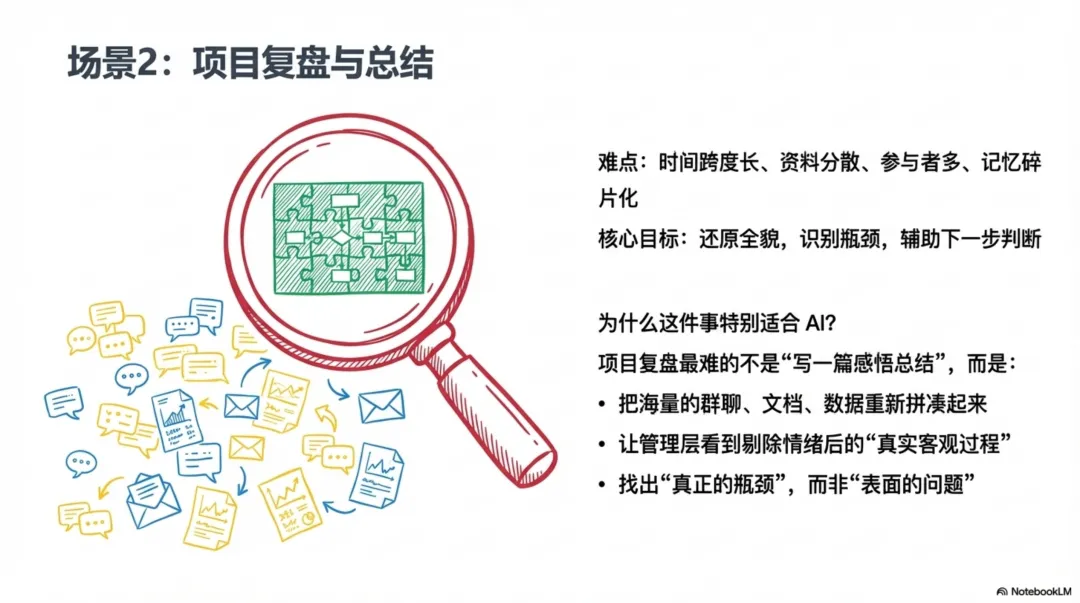 切肤之痛:我们的很多研发项目周期往往横跨数月甚至一年以上。在如此漫长的周期中,项目信息如涓涓细流,散落在项目群的数千条聊天记录、几十个版本的飞书文档、以及各种附件之中。项目结束时,要求项目经理进行一次全面、客观、深入的复盘,往往是一项极其痛苦的“考古”工作,不仅耗时耗力,而且极易因为信息遗漏或个人主观偏见,导致复盘流于形式,无法触及问题的本质。