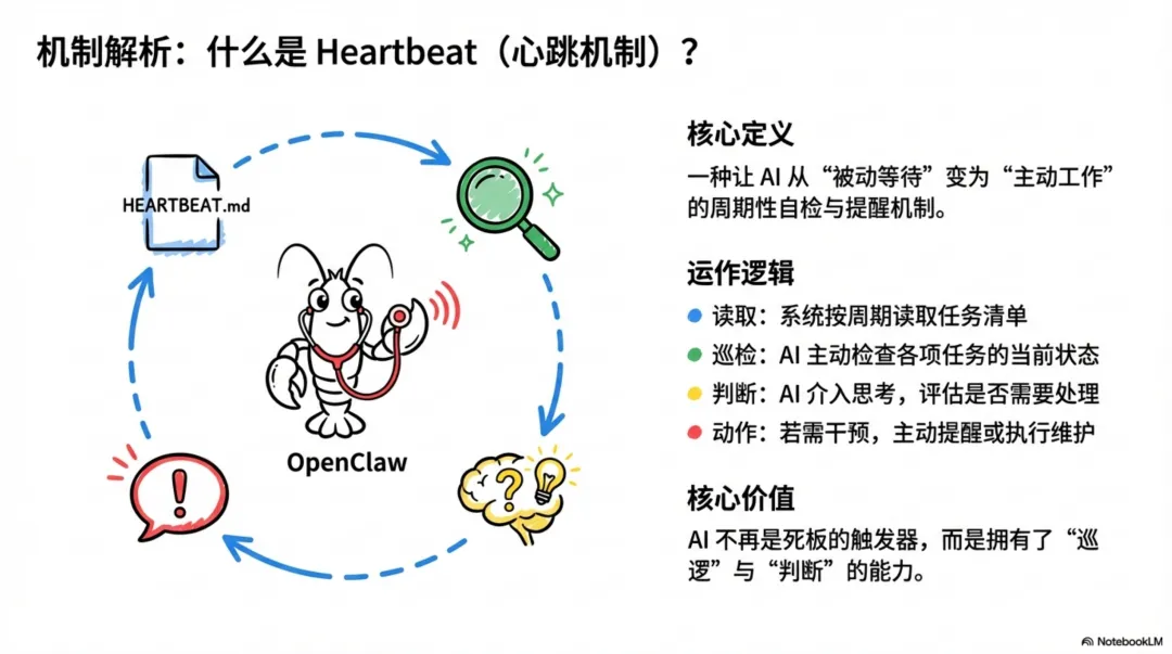 心跳机制 (Heartbeat):这是一种更轻量、更智能的“巡检”机制。你可以把它想象成一个不知疲倦的“巡逻员”。我们可以设定它每隔一段时间(例如30分钟)“醒来”一次,执行一系列检查动作。例如,它可以检查是否有某个自动化任务卡住超过了预设时间,或者巡视某个关键的项目看板,如果发现“高优先级”任务的状态连续三天没有更新,它可以主动在群里@相关负责人进行提醒。 心跳机制赋予了「明序」一种“警觉性”和“感知力”,使其从一个任务执行者,升级为一个环境监控者。