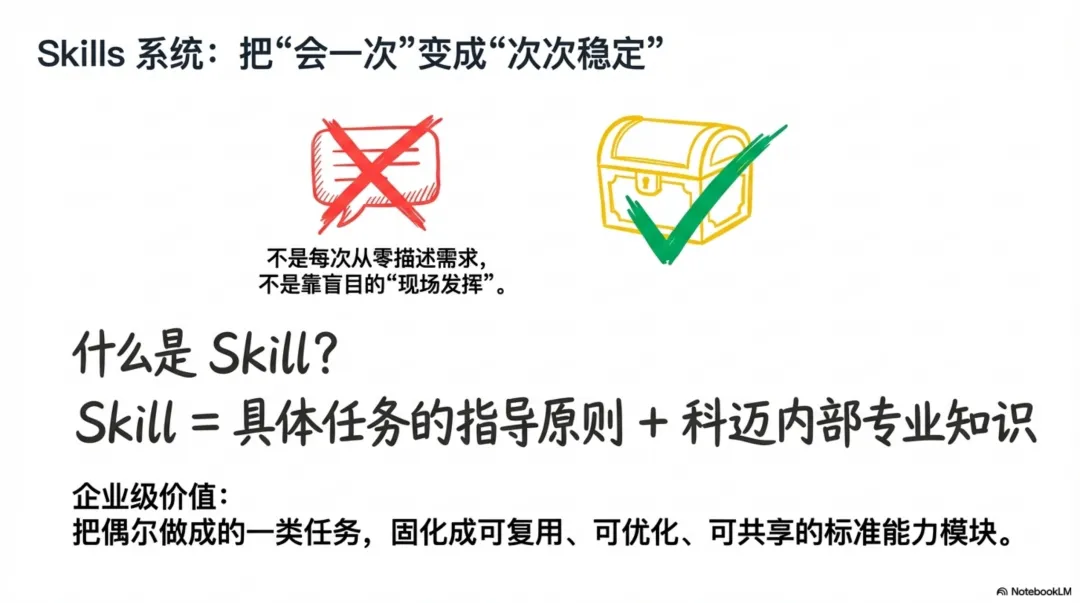 它解决了一个核心问题:如何将个人偶然的“灵光一现”或专家的“最佳实践”,转化为组织可依赖的、稳定的“标准化能力”。我们上面提到的所有六大场景,其背后都对应着一个或多个我们精心编写和迭代的Skill。