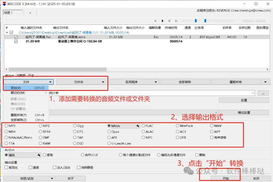 【内部群】关注我们,并回复:进群分享模式:免费/绿色,按教程安装下载地址:见本文结尾XRecode 是一款相当简洁的音频文件转换软件,如格式转换、CD抓轨、音频提取等,支持常见的 MP3、WMA、WAV 等格式的转换.可将 mp3、mp2、wma、ogg、flac、wav、mp4、aac 等音频文件转换成 m4a、alac、ape、flac、mp3、mp4、ogg、raw、wav、wma、WavPack、mpc、mp2、Speex、ofr、ac3 等格式。最新版:XRecode 3 v1.180 简洁的音频文件转换软件 中文版主要特点广泛的格式支持:XRecode III 支持从多种源格式转换到多个目标格式,包括但不限于 m4a, ALAC, APE, FLAC, MP3, OGG, WavPack 等。多文件并行转换:可以同时转换多个文件,提高工作效率。内置元数据编辑器:允许用户编辑音频文件的元数据,例如艺术家、专辑封面等信息。高兼容性:可以在 Windows XP 到 Windows 11 的操作系统上运行,甚至在 Linux 的 Wine 环境下也可以使用。高质量转换:对于不同的音频编码,提供了详细的设置选项以确保最佳质量输出。便携模式:支持 Portable 模式,可以方便地在 U 盘或其他可移动存储设备中运行。嵌入式 CUE 表支持:支持将 CUE 曲目表嵌入到 FLAC, WavPack, APE 和 TAK 文件中。章节文件支持:支持 mp4 和 mka 格式的章节文件,可以按照章节拆分音频文件。实时音频 CD 抓取:能够即时抓取多音轨的音频 CD 并转换成所需的音频格式。多语言界面:提供多国语言界面选择,包含简体中文,使得非英语用户也能轻松使用。XRecodeIII 是一个集成了多种功能于一身的高效音频转换工具,其丰富的特性和简易的操作流程使其成为处理音频文件的理想选择。无论是个人用户还是专业音频工作者,都能从中受益,实现快速、高质量的音频格式转换。不过目前 XRecode III 仅支持 Windows 版本安装使用教程一、绿色便携版1、在本文末尾,下载软件后,解压,即可得到如下文件和文件夹2、以管理员身份或双击文件“xrecode3x64.exe””运行,按提示进行安装。建议关闭防火墙或使用防火墙管理工具,以免安装文件被误杀,导致工具无法启动二、安装版1、在本文末尾,下载软件后,解压,即可得到如下文件和文件夹2、以管理员身份或双击文件“XREcode3_Win64_1.161_mefcl_Setup.exe””运行,按提示进行安装。建议关闭防火墙或使用防火墙管理工具,以免安装文件被误杀,导致工具无法启动3、使用 XRecode III 非常简单,只需将要转换的音频或视频文件拖放到软件界面上,然后选择目标格式即可开始转换。对于有特殊要求的用户,还可以通过点击设置按钮来调整更细致的转换参数,比如比特率、采样率等,以获得最满意的转换效果。另外,我们还有6000G软件资料下载提供,有需要的就去下载吧。该软件可能没几天就会被/删/除了,所以,需要该软件的,赶紧下载,不要等消失了,再来找我哈!觉得我说明白了的朋友,给我右下角赞赞赞!