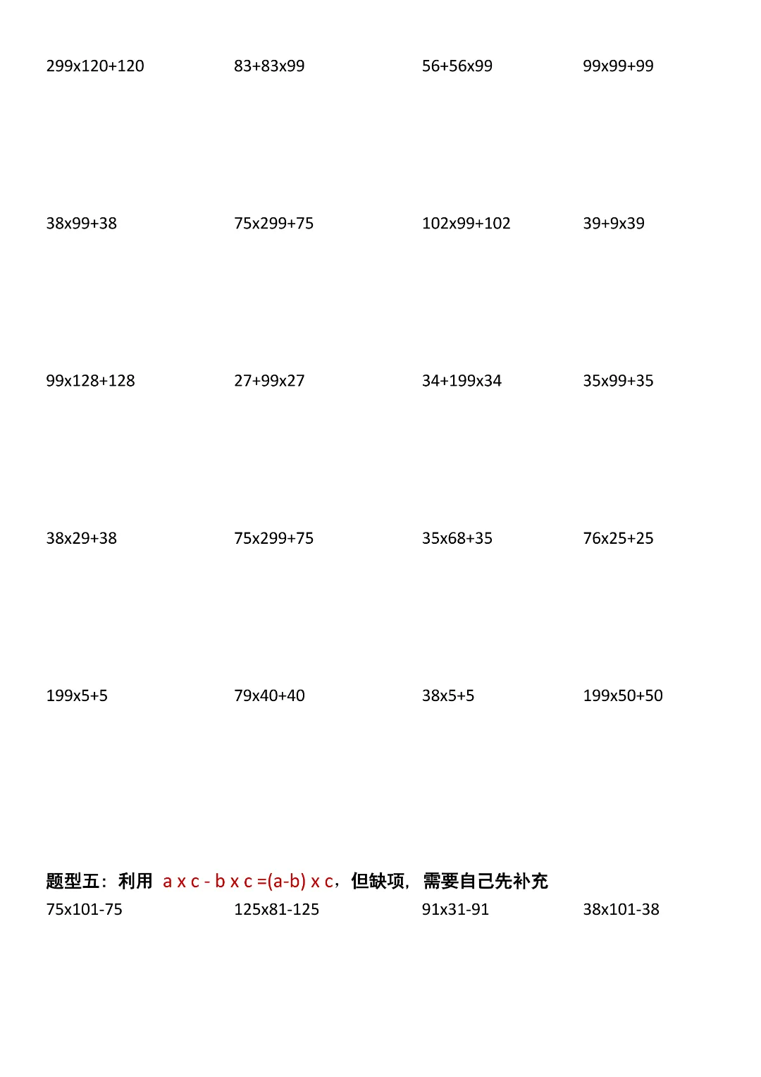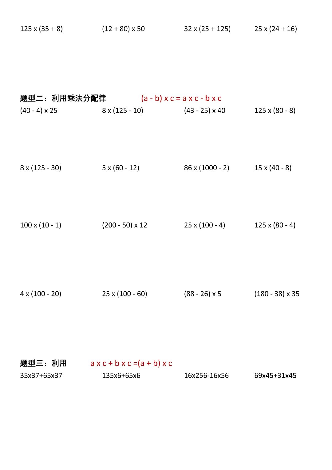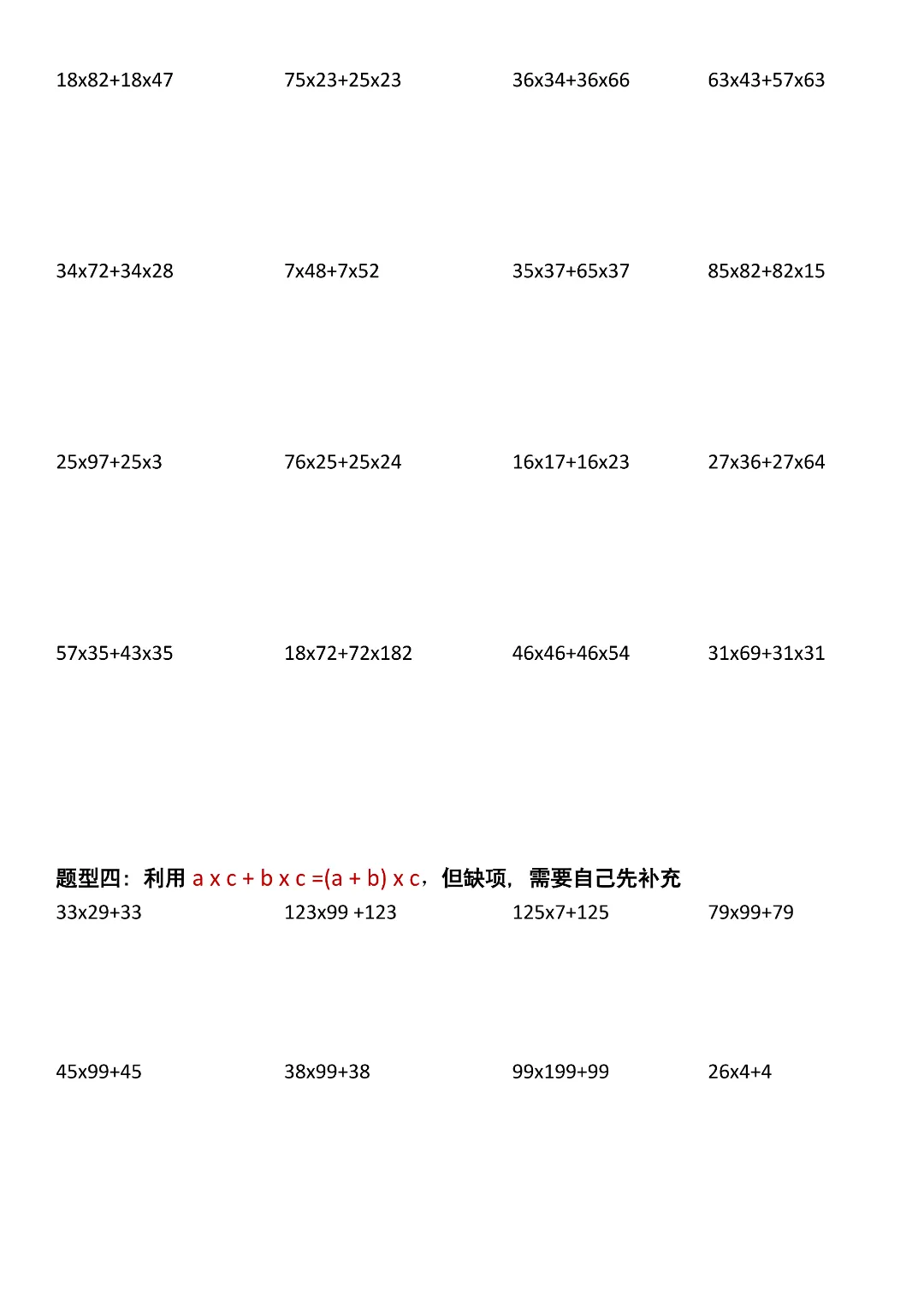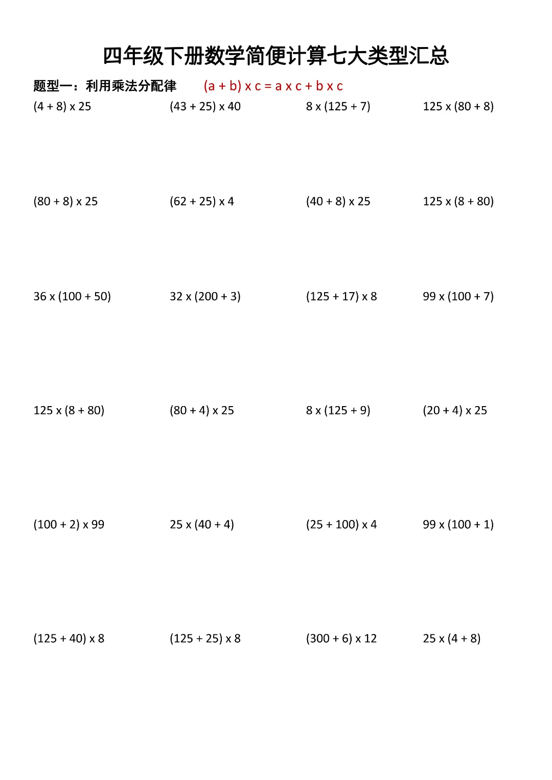 四年级下册数学(简便计算七大类型汇总),电子版可下载可打印