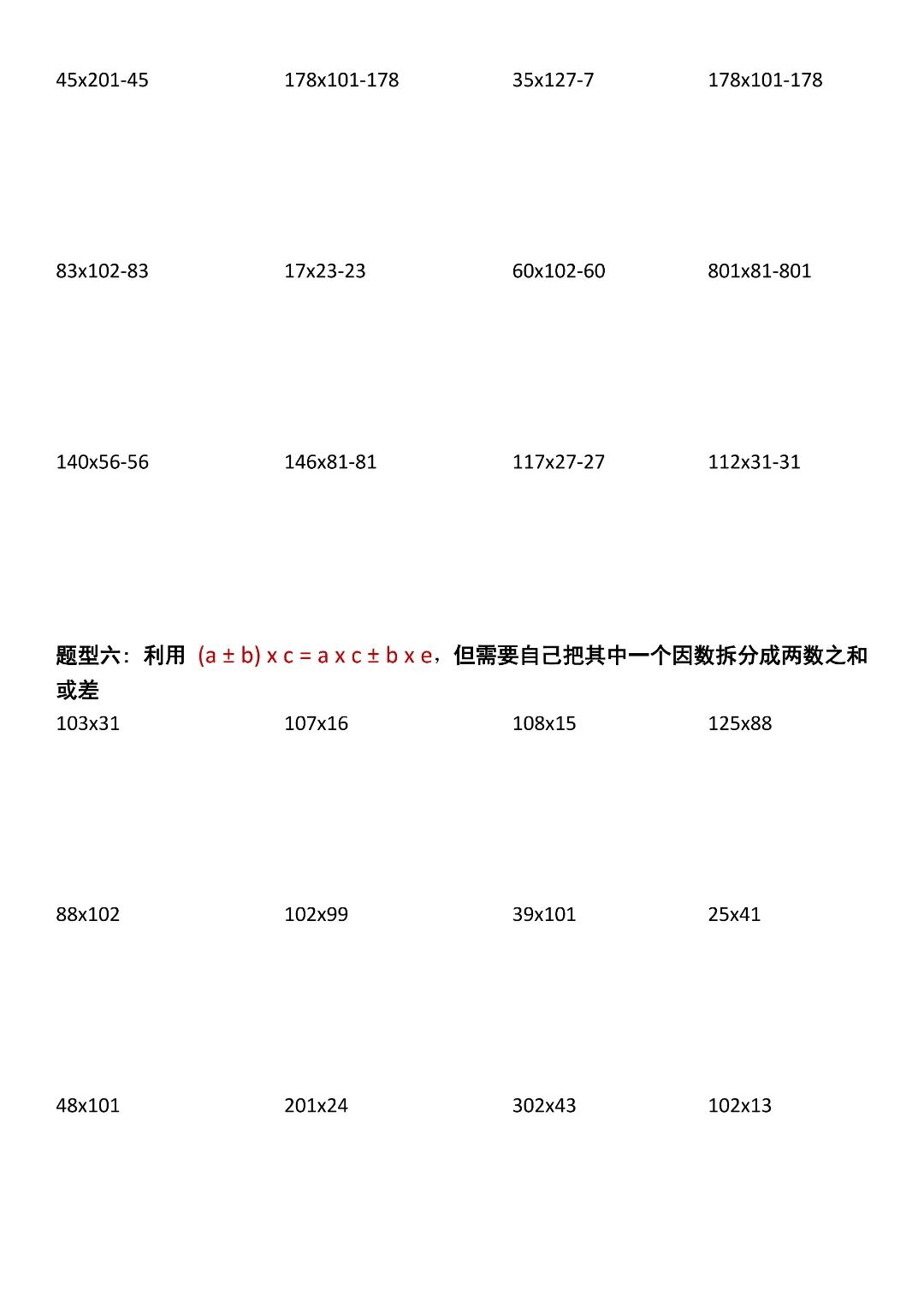 四年级下册数学简便计算七大类型汇总,共6页,电子版可下载可打印。通过这份四下简便计算练习题,帮助孩子快速识别题型,灵活运用计算技巧,提升数学计算速度和准确率。有需要的家长抓紧打印出来,让孩子练一练吧!