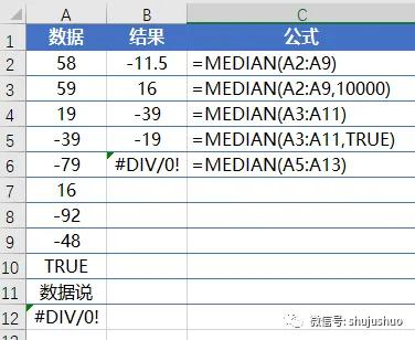 如果参数集合中包含偶数个数字,median将返回位于中间的两个数的平均值,如C2单元格;