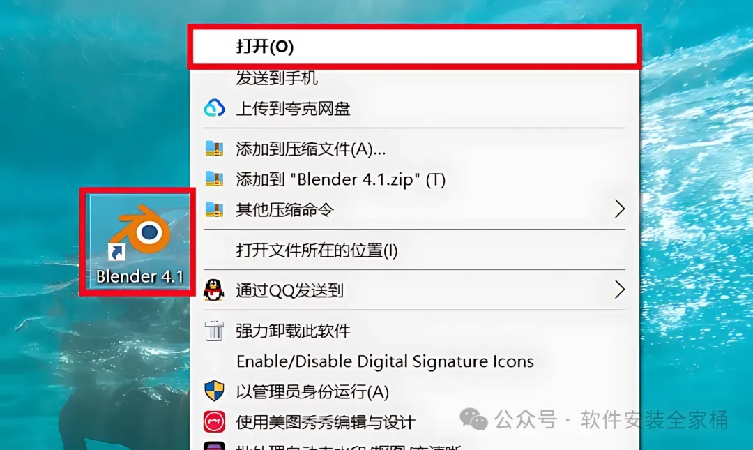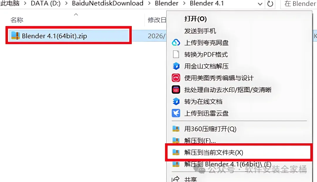 1.下载Blender 4.1软件安装包到电脑上,右键选择【解压到当前文件夹】。