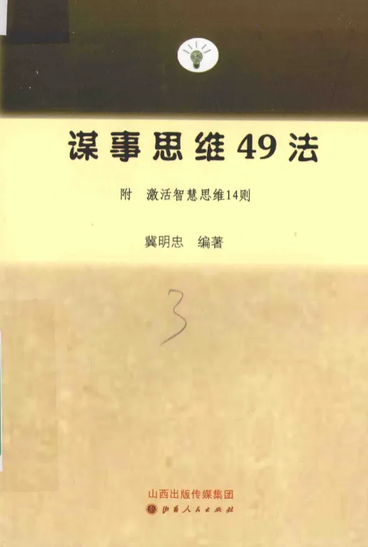 《谋事思维49法》是由冀明忠编著、山西人民出版社于2016年出版的思维方法实用指南,全书约206页,系统梳理了八大类别共49种谋事思维方法与14则激活思维智慧的要诀,涵盖情感类、视角类、驱动类、时机类、传统经典类、查找类、演算类及哲学类基本思维等维度,从强者思维、逆向思维到借鸡下蛋、出奇制胜,从穷追不舍的查找逻辑到排列组合的演算智慧,构建了一套覆盖目标设定、问题分析、资源调配到行动闭环的全流程思维操作系统。这本书并非空泛的理论堆砌,而是从真实工作场景中提炼出的实战工具,强调”易学实用”,既可单独运用某种思维破解特定难题,也可灵活组合多种方法应对复杂局面,帮助读者打破”想得多做得少”的困境,实现从模糊焦虑到清晰笃定的转变,无论是职场中寻求突破的决策者、创业路上需要破局思路的实干家,还是面临人生困惑渴望找到新出路的探索者,都能从中获得一套可复制、可验证的思维框架,将零散的经验转化为系统的谋略,最终在具体事务中做到想得清、干得成,让思维真正成为改变现实的力量。