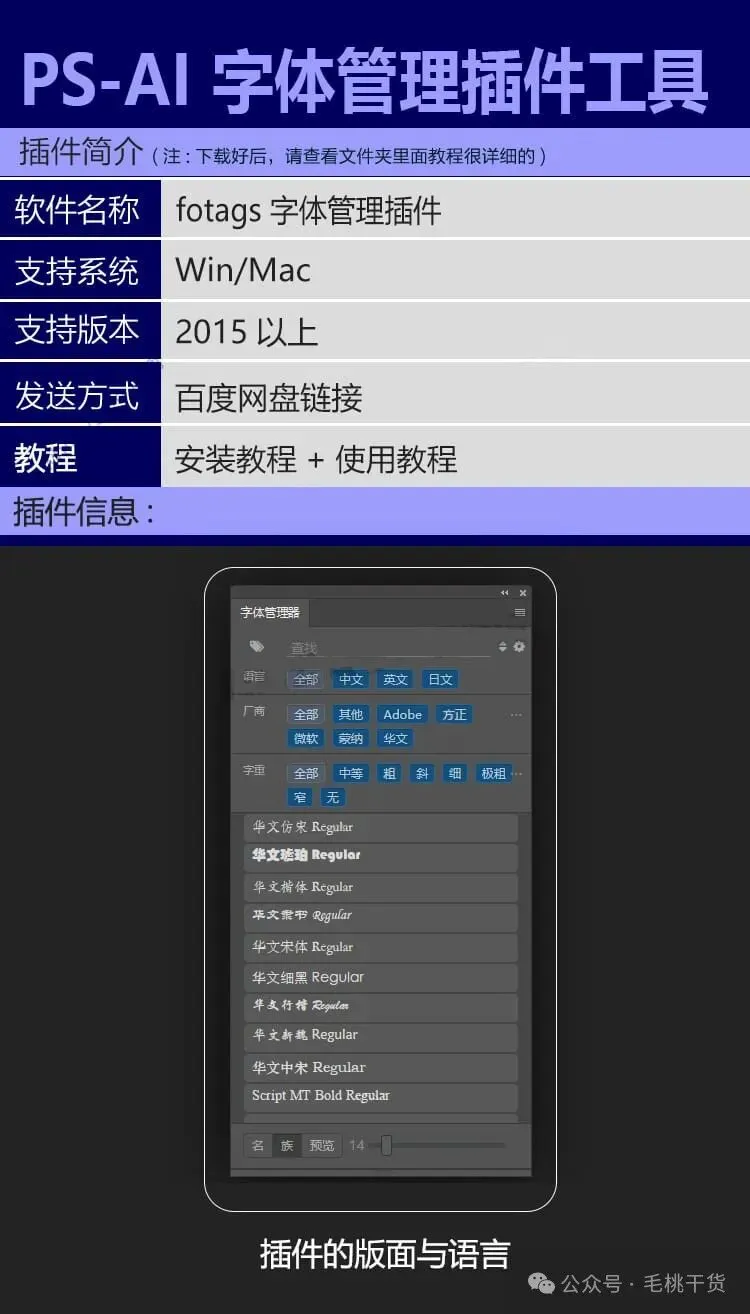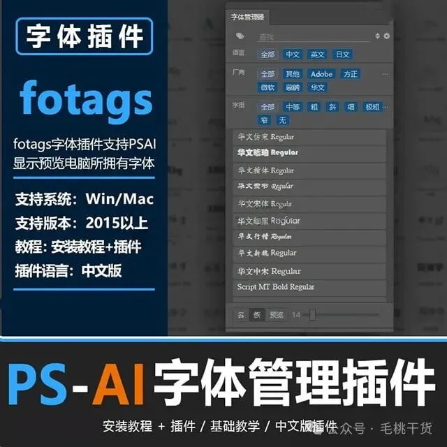 PS/AI字体管理插件【1864】 公众号改推送机制啦!点左上角蓝字毛桃干货,设置星标★,好资源不错过! 本期 | PS/AI字体管理插件 提供方式:百度网盘 获取方式在文章底部 炒鸡棒的资源 喜欢的话赶快下载吧! 👇资源获取方式👇 长按二维码或微信搜索关注公众号 毛桃干货(ID:mtgh326) 在后台回复 1864 👇首批会员限时特惠👇 全站资源一键领取 无需等待,极速下载 ※赠送价值千元会员礼包※ 免责声明:本文资源均为通过网络等公开合法渠道获取的资料,仅作为学习交流,其版权归出版社或者原作者所有,本公众号不对所涉及的版权问题负责。侵删,谢谢!
