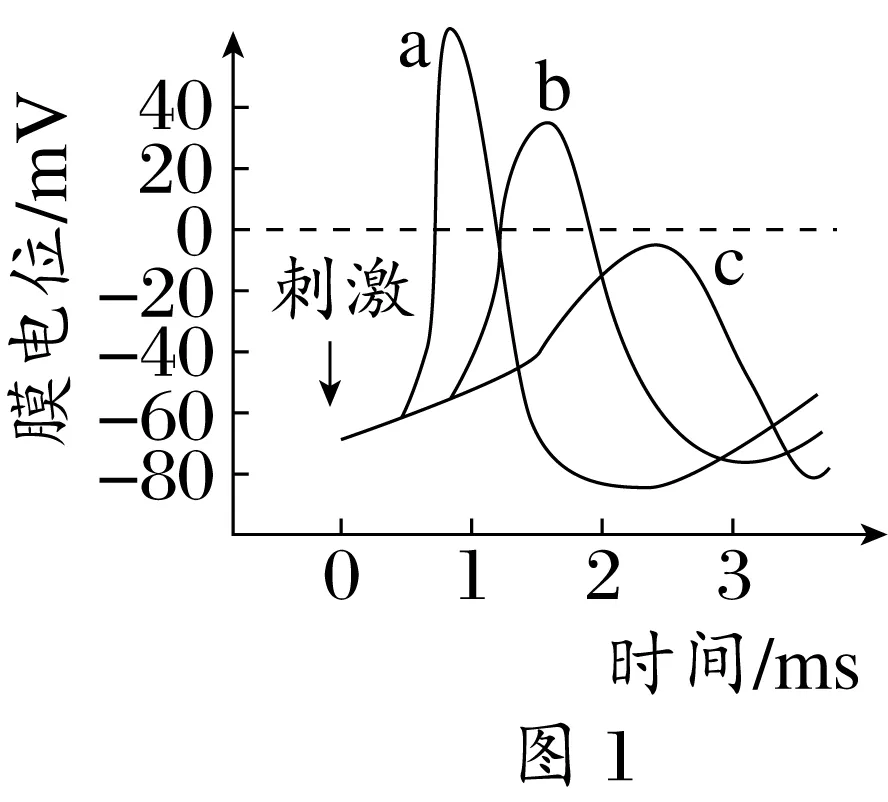 (3)据图1分析,影响动作电位峰值的主要因素是细胞外液中Na+浓度,a、b、c三种细胞外液中Na+浓度高低的关系是a>b>c。