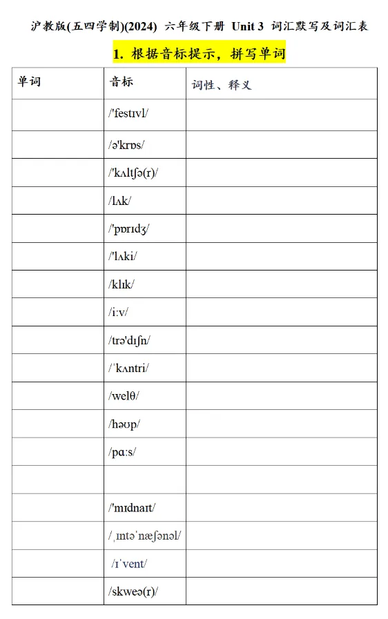 为此,舟舟特意整理了 【上海六年级下册英语新教材词汇默写及词汇表】,完全同步新教材单元顺序,排版整洁清晰,支持直接打印。包含两种默写模式:根据音标写单词+释义、根据汉语写英文,默写完就能对照自查,让孩子每天花一点时间,稳步夯实单词基础。