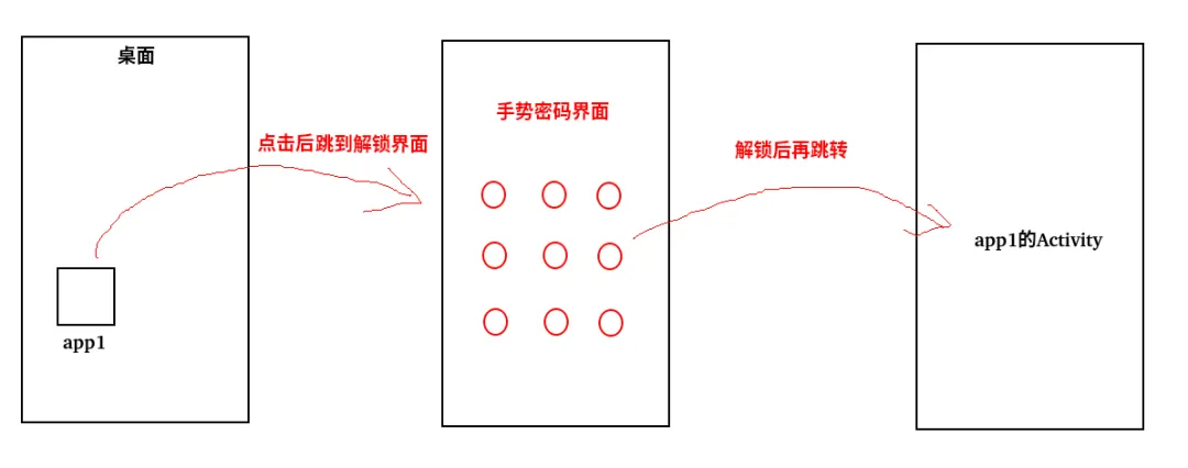 针对某个app加入应用锁后,点击app后会进入手势密码等界面,解锁以后才可以进入app的Activity。