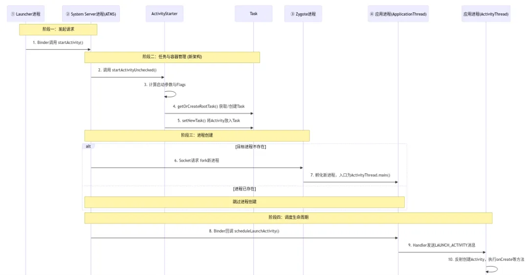 决策:ATMS 检查目标 Activity 的进程是否存在。若不存在,则通过 Socket 向 Zygote 进程发送请求。 -