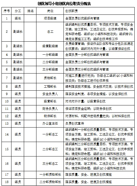 创优领导小组负责工程创优的组织领导工作,传达上级及建设单位对工程质量的要求,检查、督促、实施情况,协调处理创优工作中的问题,开展工程质量评奖,各专业队也成立相应的工程创优领导小组,具体负责创优规划的实施,制定工程创优的施工措施和重点项目,组织开展QC小组活动。