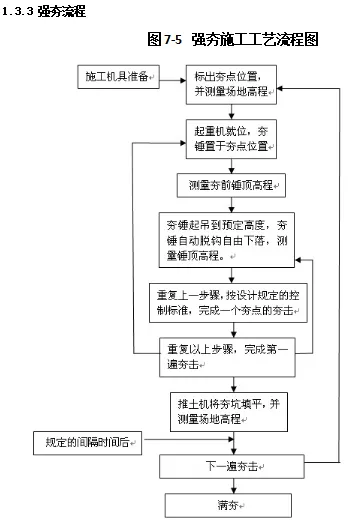 4)间隔时间取决于土中超静孔隙水压力的消散时间。凡是产生超孔隙水压力、夯坑周围出现较大隆起时,不能继续夯击,要等超孔隙水压力大部分消散后,再夯下一遍。在一遍中若干夯击次数后出现上述情况,也要遵循这一要求,停止夯击,等超孔隙水压力大部分消散后,再夯下一遍。具体间隔时间可根据工艺性试夯确定。施工时首先保证夯击遍数间隔时间,并做详细记录,其次可根据实际情况调整施工流水顺序,安排合理的流水节拍,力争使各区段间达到连续夯击。杜绝间隔时间未到就强行施工现象,确保强夯质量。