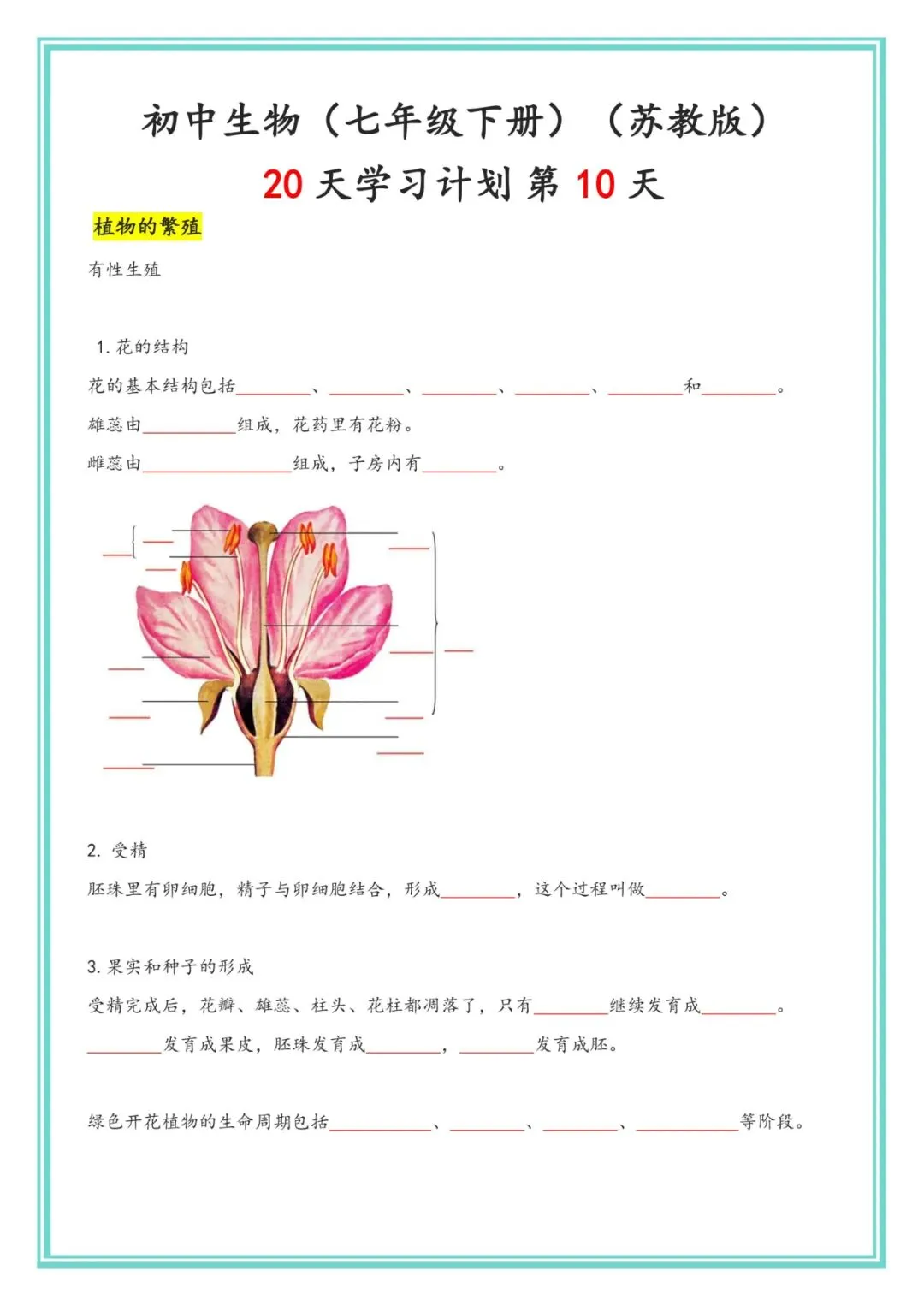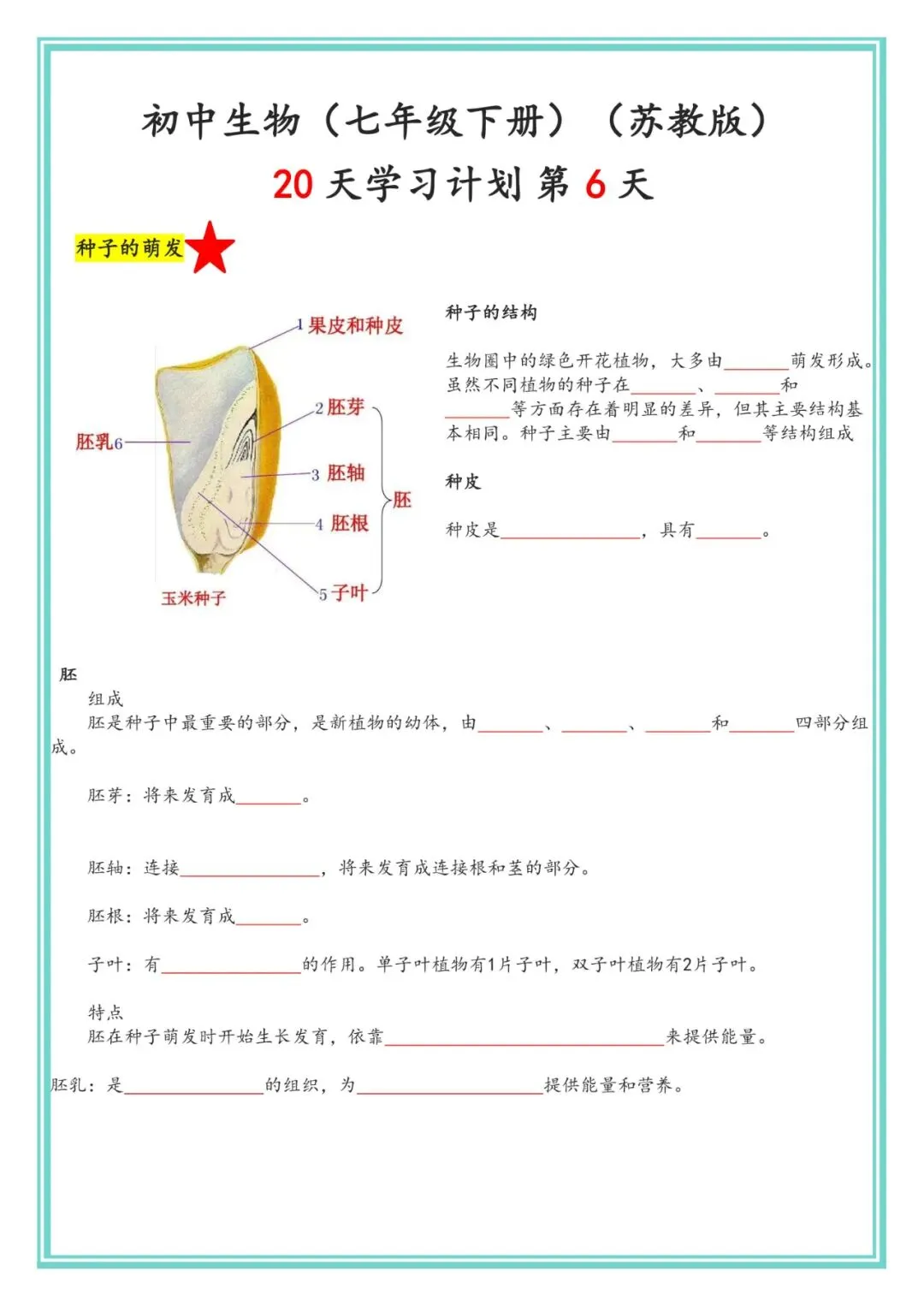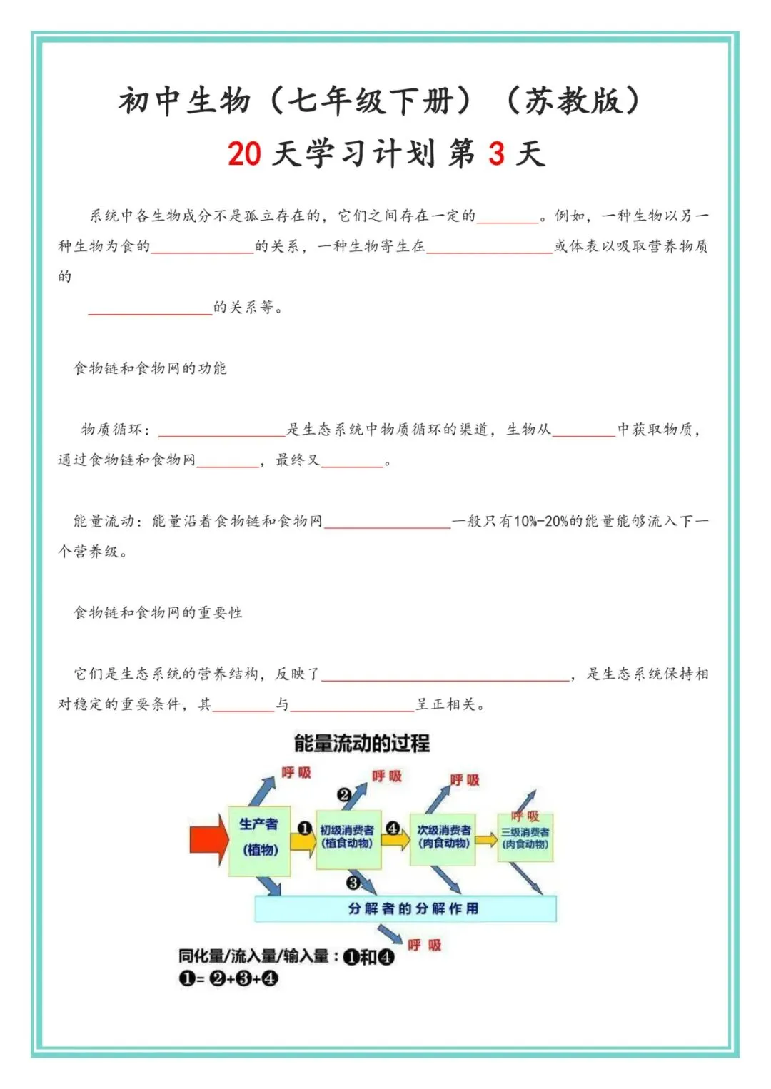 今日老师为大家整理好了相关资料:七年级下册生物苏教版 20 天复习计划电子版可打印