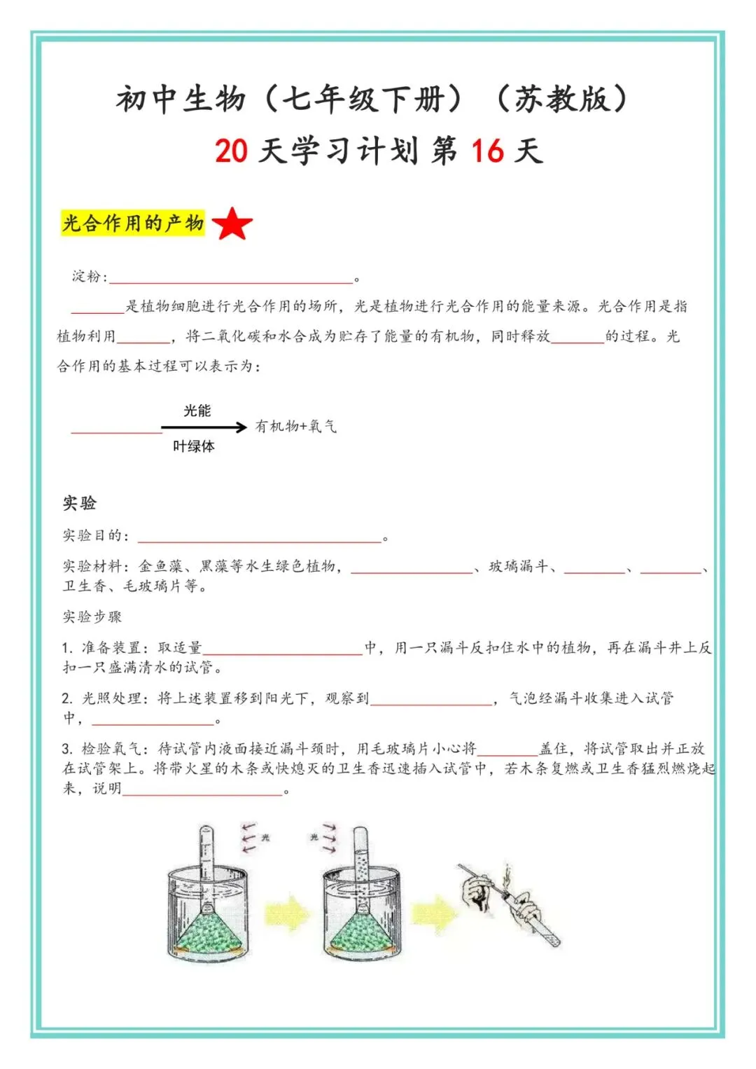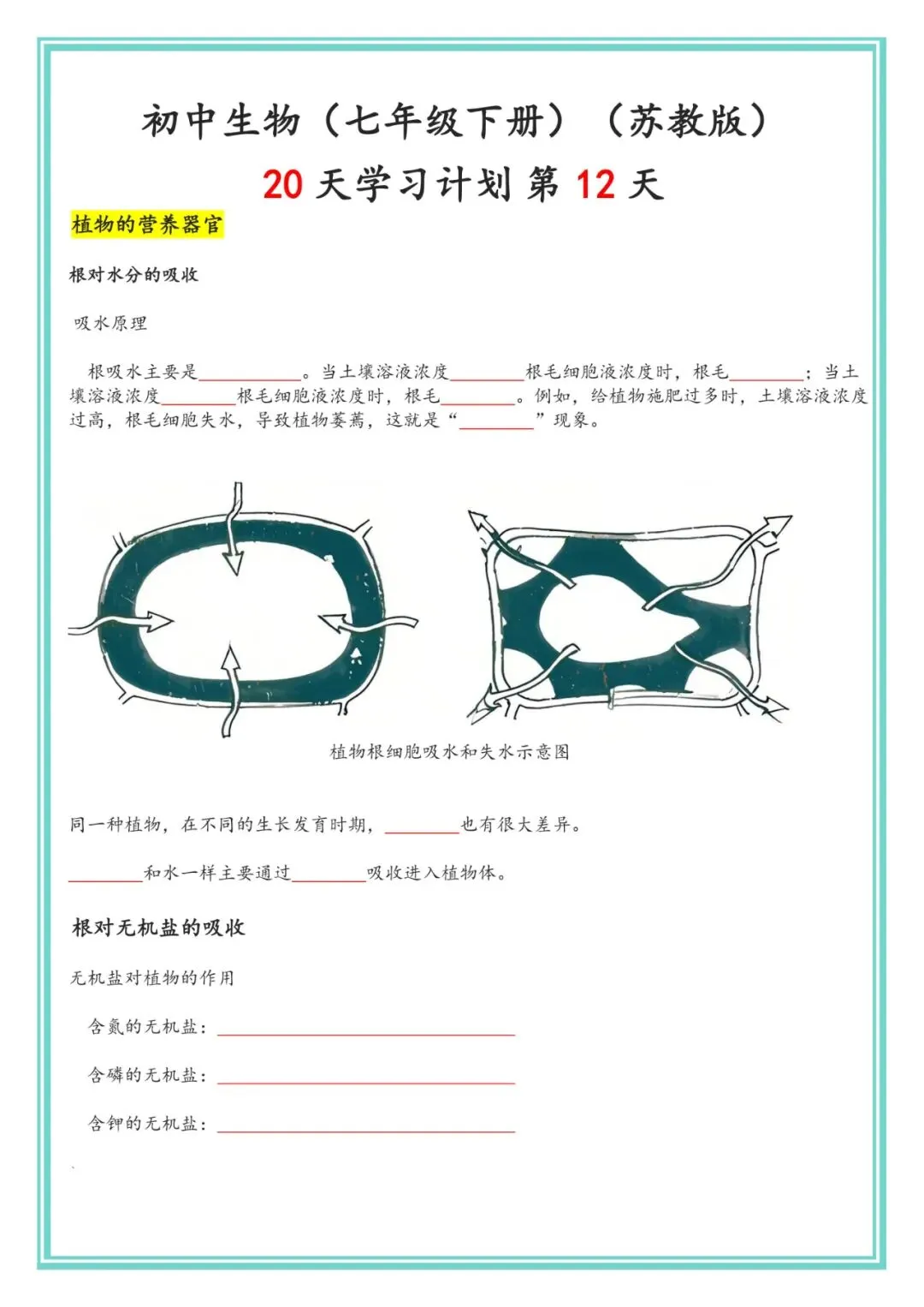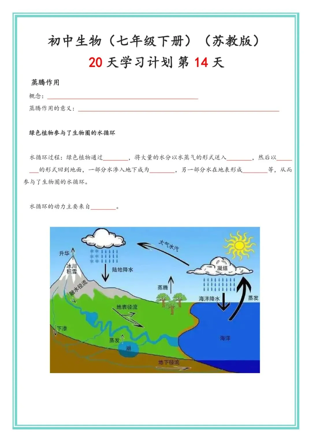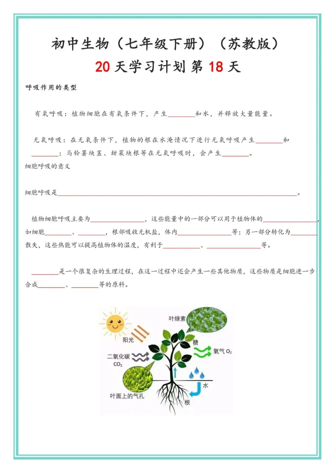 今日老师为大家整理好了相关资料:七年级下册生物苏教版 20 天复习计划电子版可打印