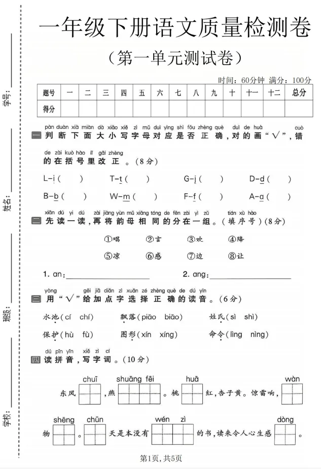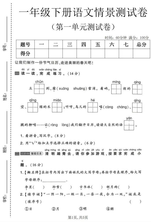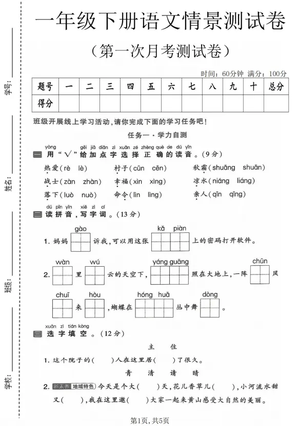 一年级(下)语文第一次月考情景测试卷,文末有完整版电子版免费领取