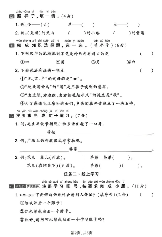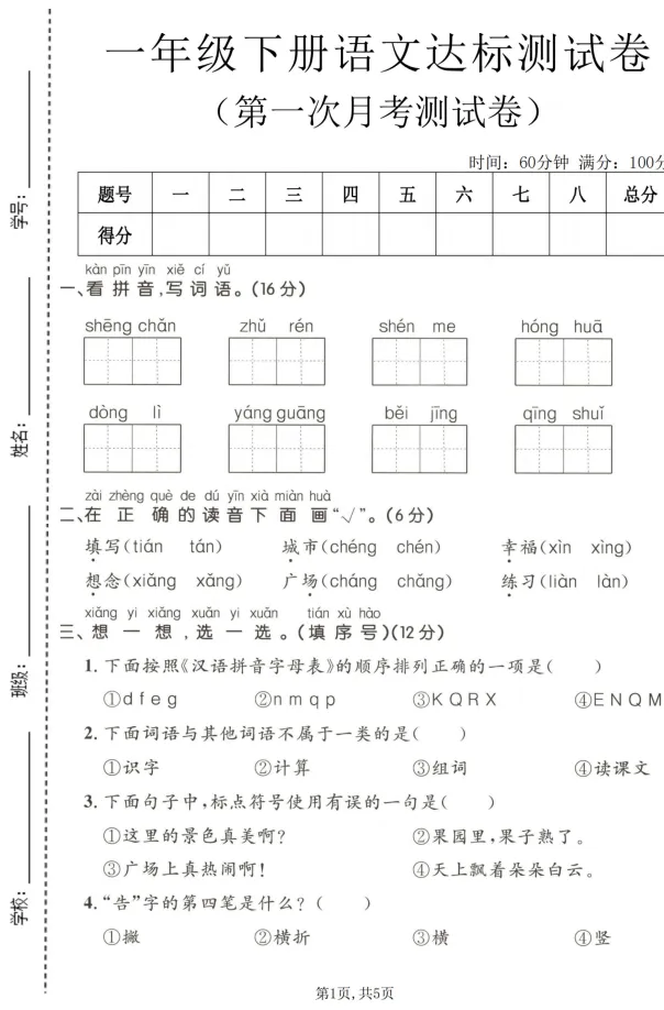 一年级(下)语文第一次月考情景测试卷电子版免费领取