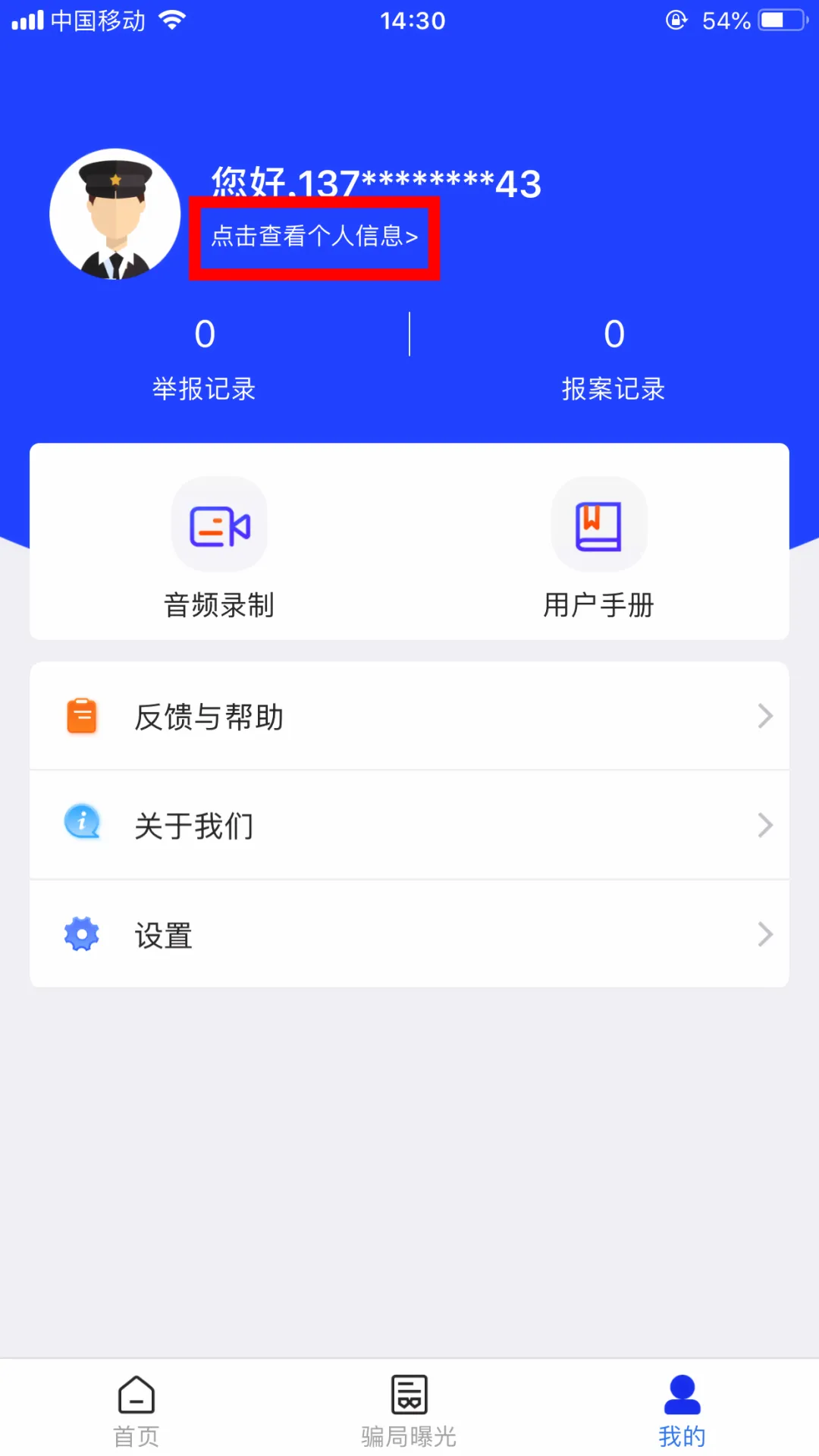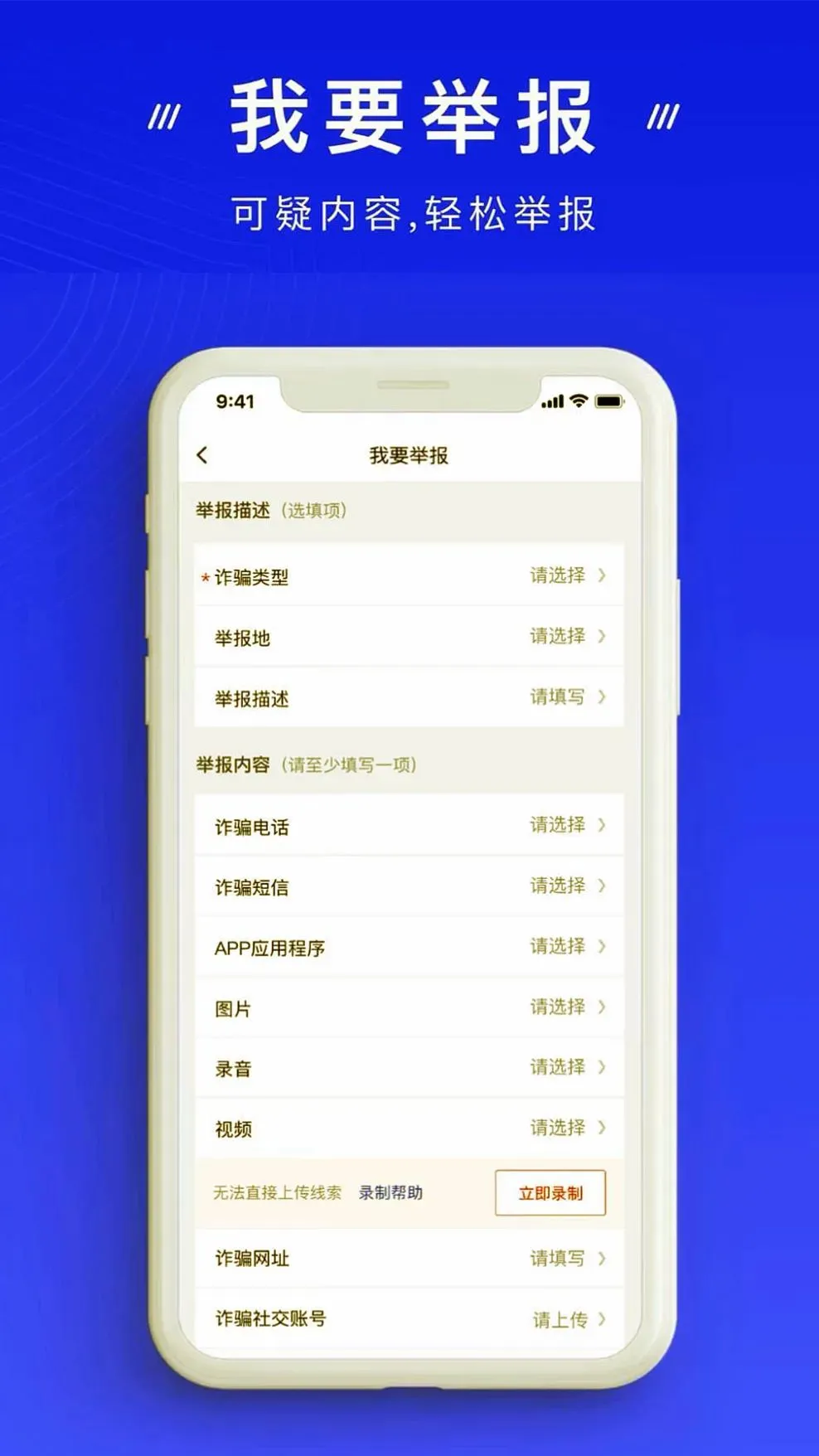 用户使用手机过程中,如发现可疑的手机号、短信,赌博、钓鱼网站,诈骗APP等信息,可在“我要举报”模块进行举报。