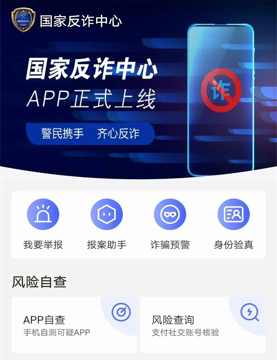报案助手、举报线索、诈骗预警、反诈宣传
