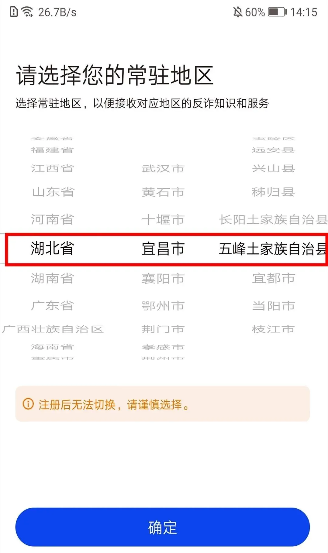 二、打开应用,选择常驻地区。