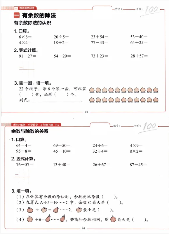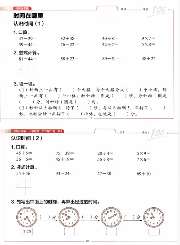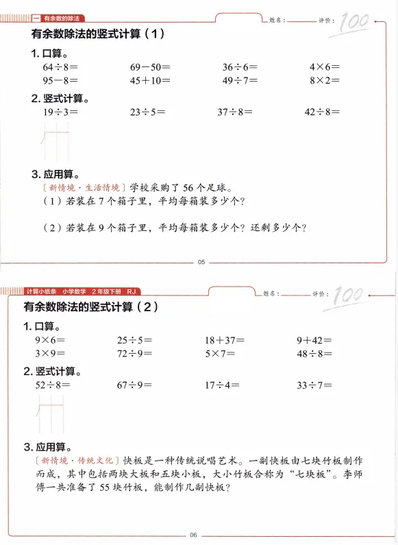 二年级下册数学每日一练小纸条,文末有完整版电子版免费领取