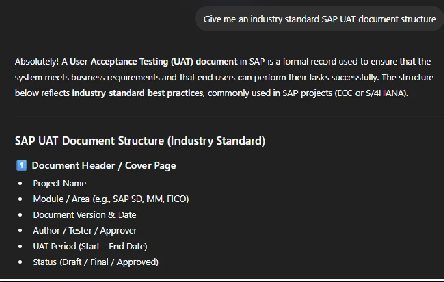 In global SAP projects, where teams and clients operate across different countries, AI helps reduce language barriers. AI can help rewrite explanations into clear and business-friendly language, reducing miscommunication. It can also translate full documents.