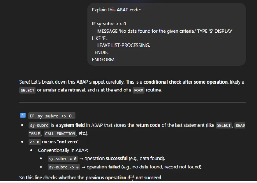 AI also strengthens ABAP development. SAP functional consultants can use AI to structure clearer logic explanations, improving alignment with ABAP consultants. In addition, AI enables SAP functional consultants to better understand ABAP code written by the ABAP consultant, allowing them to analyze issues more independently when needed.