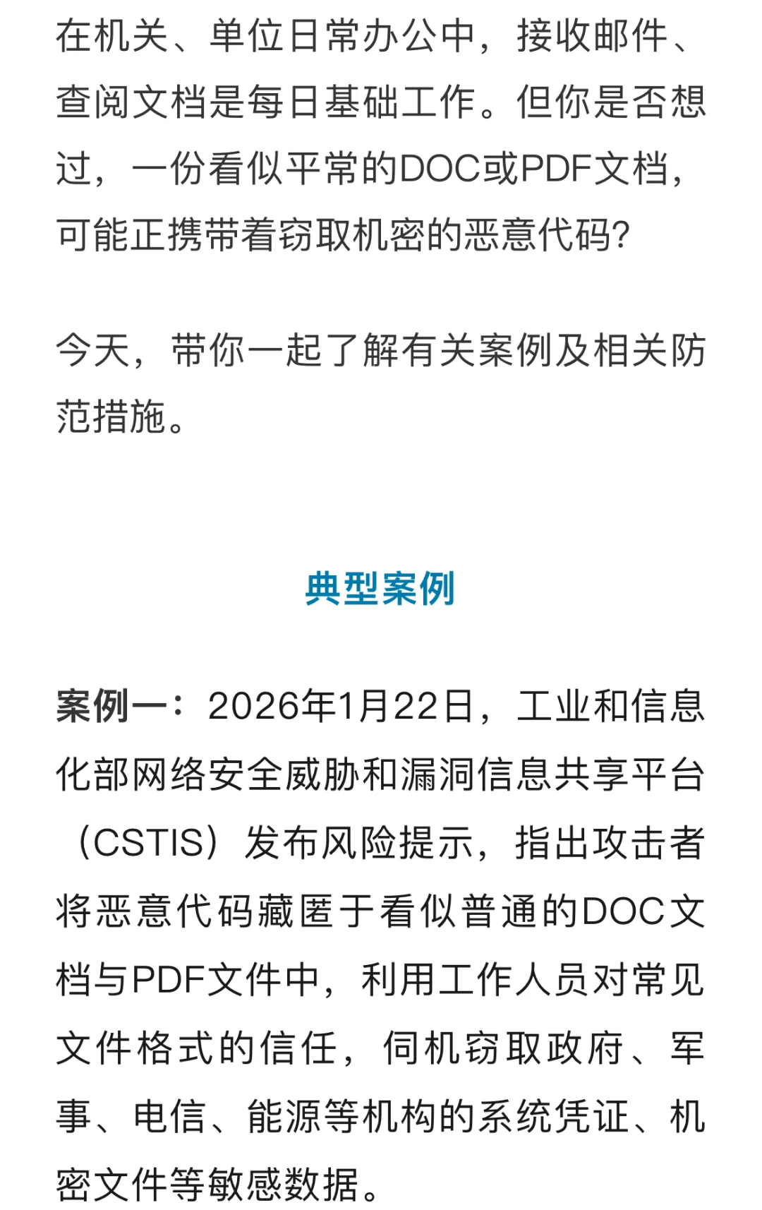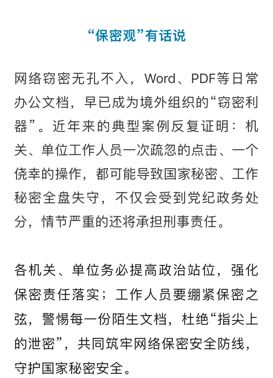 机关、单位速查!你的Word、PDF可能泄密…… 往期推荐>> 多名新入职人员因泄密被处分 开这种会,记得拉窗帘 多名干部因泄密被处理 来源:“保密观”微信公众号 编辑:小苒 校对:小畅 初审:小千 终审:平安