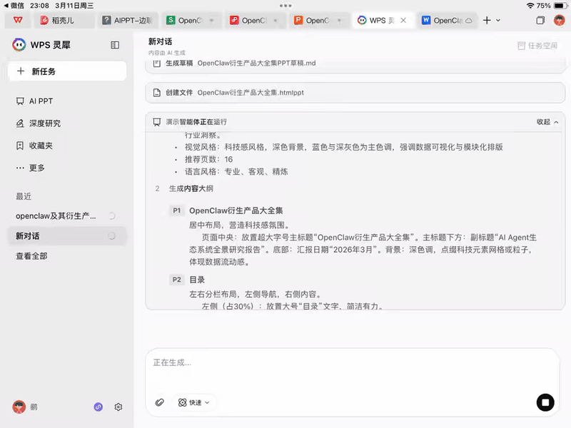 然后直接丢给灵犀生成PPT、表格、文档