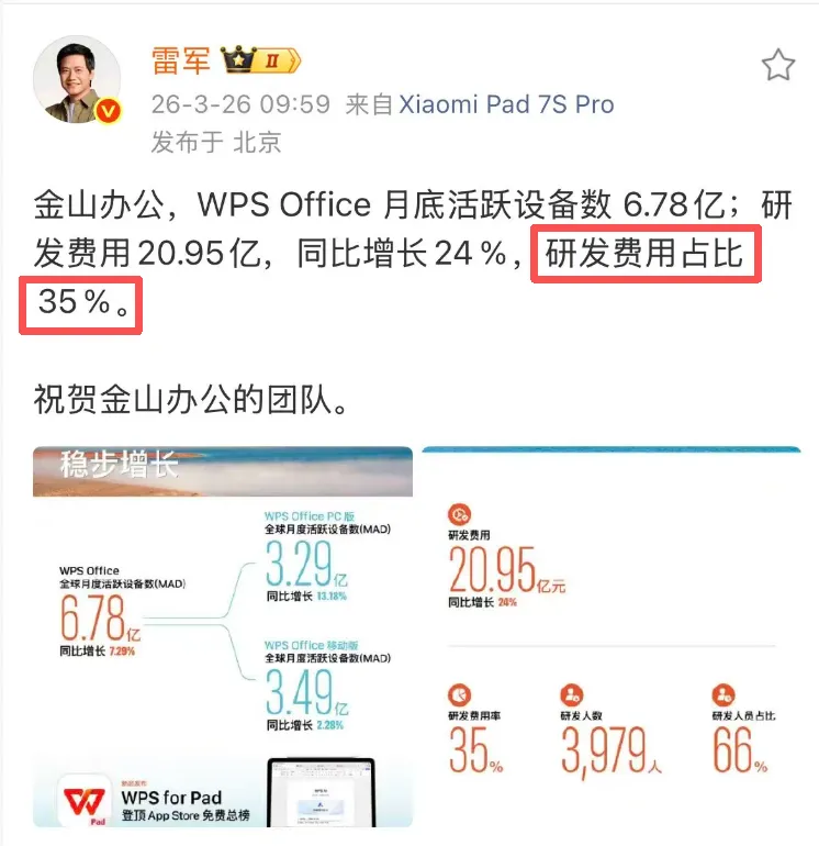 这里插播一条雷军点赞金山办公的微博: