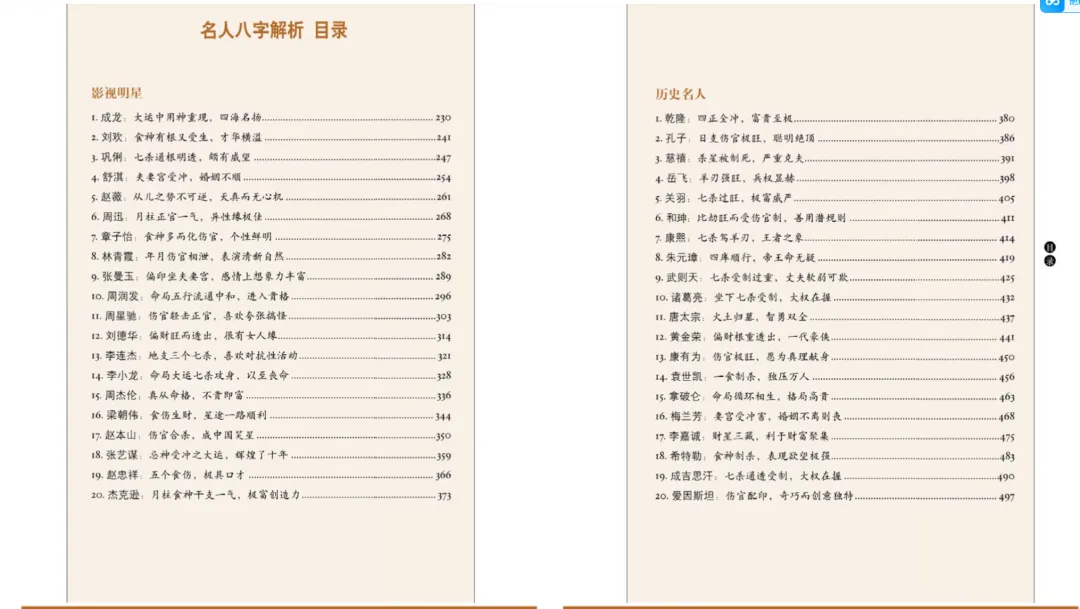 全书分为五卷,系统阐释天干地支、纳音五行、刑冲合害等基础理论,详解十神、神煞与命理格局,并收录大量论命歌赋作为实践指导。书末附有影视明星及历史名人的八字解析案例,涵盖成龙、周杰伦、乾隆、爱因斯坦等中外人物,通过具体实例展现命理学的应用逻辑。书中内容兼顾理论梳理与实战技巧,结构上以图解形式辅助讲解,降低了传统命理典籍的阅读门槛。
