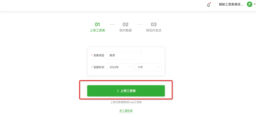 1、点此登录蚂蚁工资条!,点击【上传工资表】,上传日常使用的EXcel工资表。