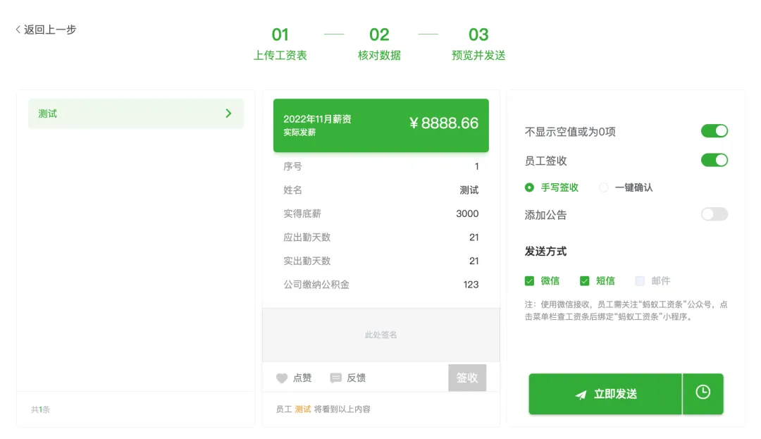 HR只需在网页端【上传工资表】→【核对上传信息】→【群发工资条】三个步骤,1分钟即可轻松完成每月工资条发送。