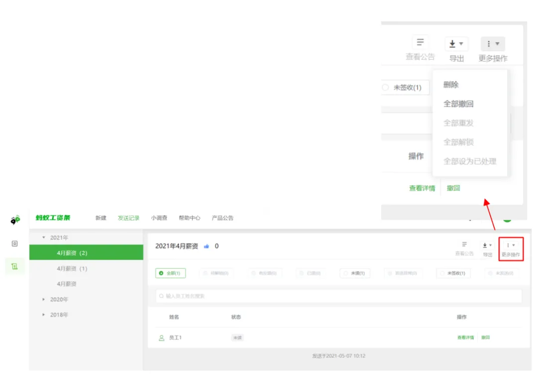 5、HR可在后台查看工资条的发送、签收、反馈情况;对于发送有误的工资条,支持单独或批量撤回、删除、重发;支持一键导出表格+签收记录,用于备存。