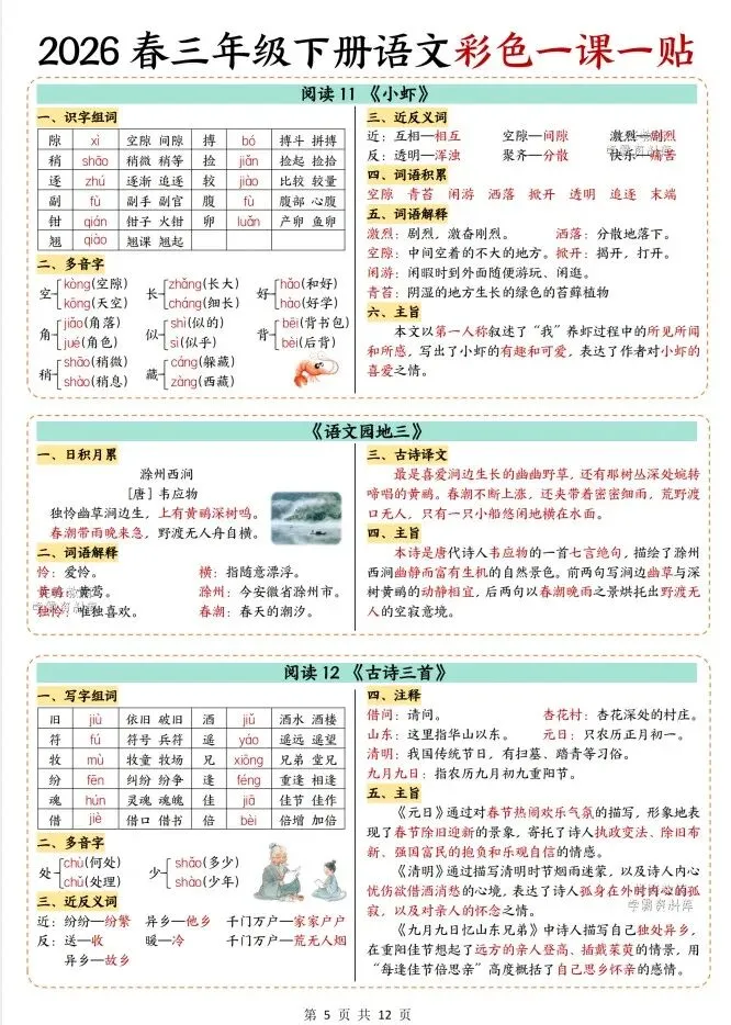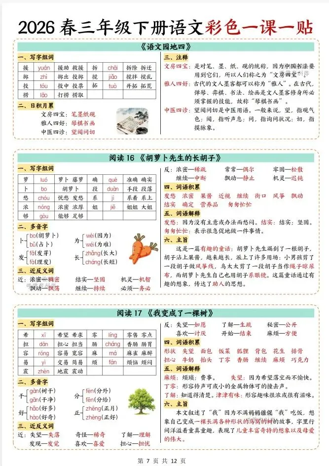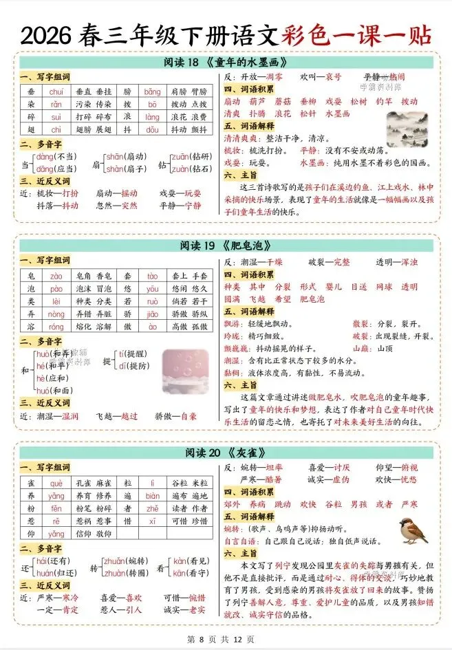 今天给大家整理了26春三年级下册语文彩色一课一贴,转发给朋友或班级群,受益更多人,帮助孩子学习!