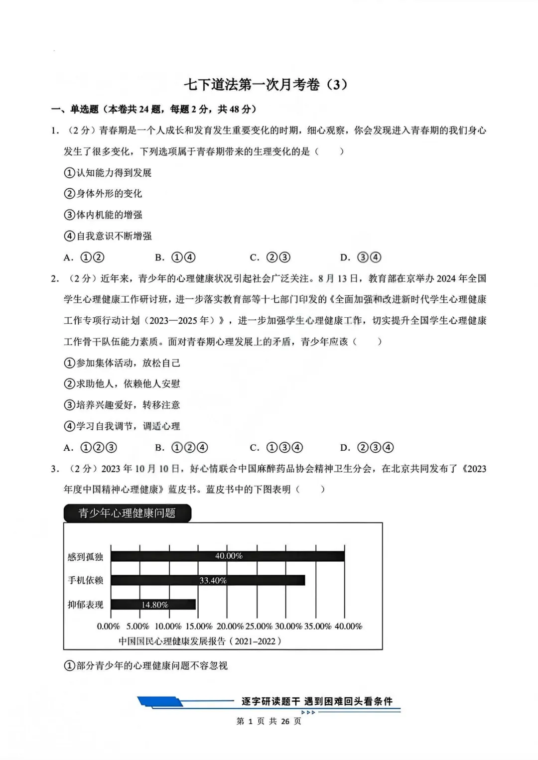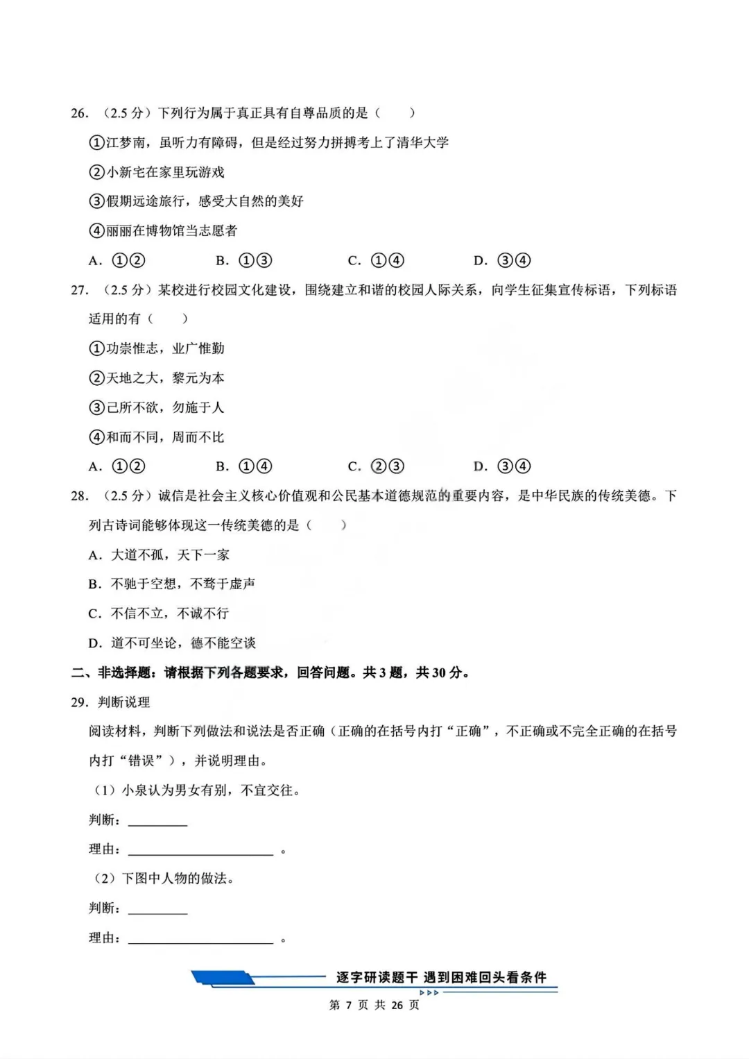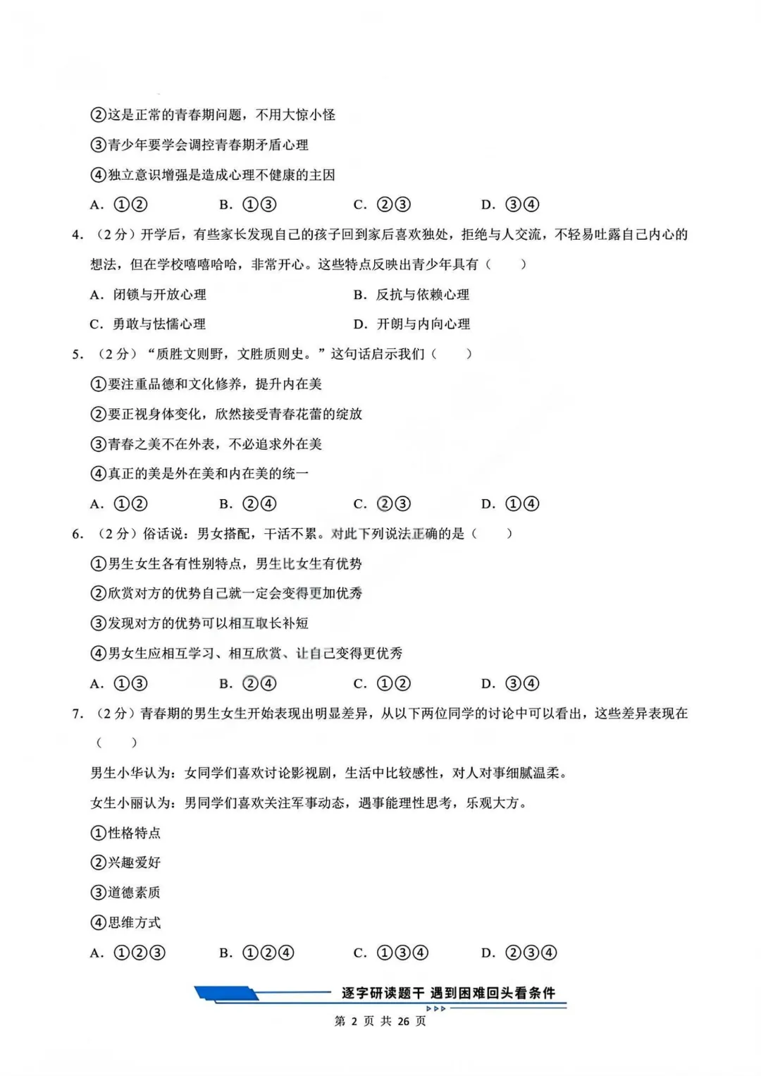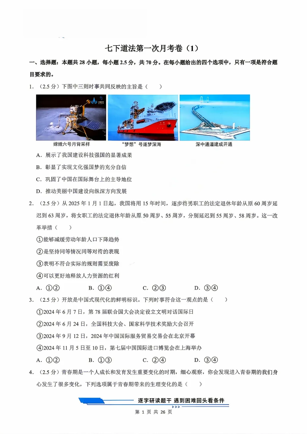 【七下道法】26年春七年级下册统编版道法《第一次月考测试卷3套》,可打印 · 点击蓝字,关注我们,加油新学期! 今天给大家分享的是:2025-2026学年七年级下册道法《第一次月考测试卷3套》含答案和解析,共79页,电子版可打印,可下载。这套七下道法第一次月考测试卷,帮助孩子检测这一阶段孩子知识点掌握情况,查漏补缺。需要的家长给孩子打印出来吧。 「领取完整电子版文档,请拉到文末 」 免费领取完整电子版: ①:点一点右下角的“👍”和“❤️” ②:在公众号对话框中回复:七年级 免责声明:本公众号所有资源分享仅供学习交流使用,公益分享,内容及图片均来自网络,如涉及侵权,请联系管理员删除。
