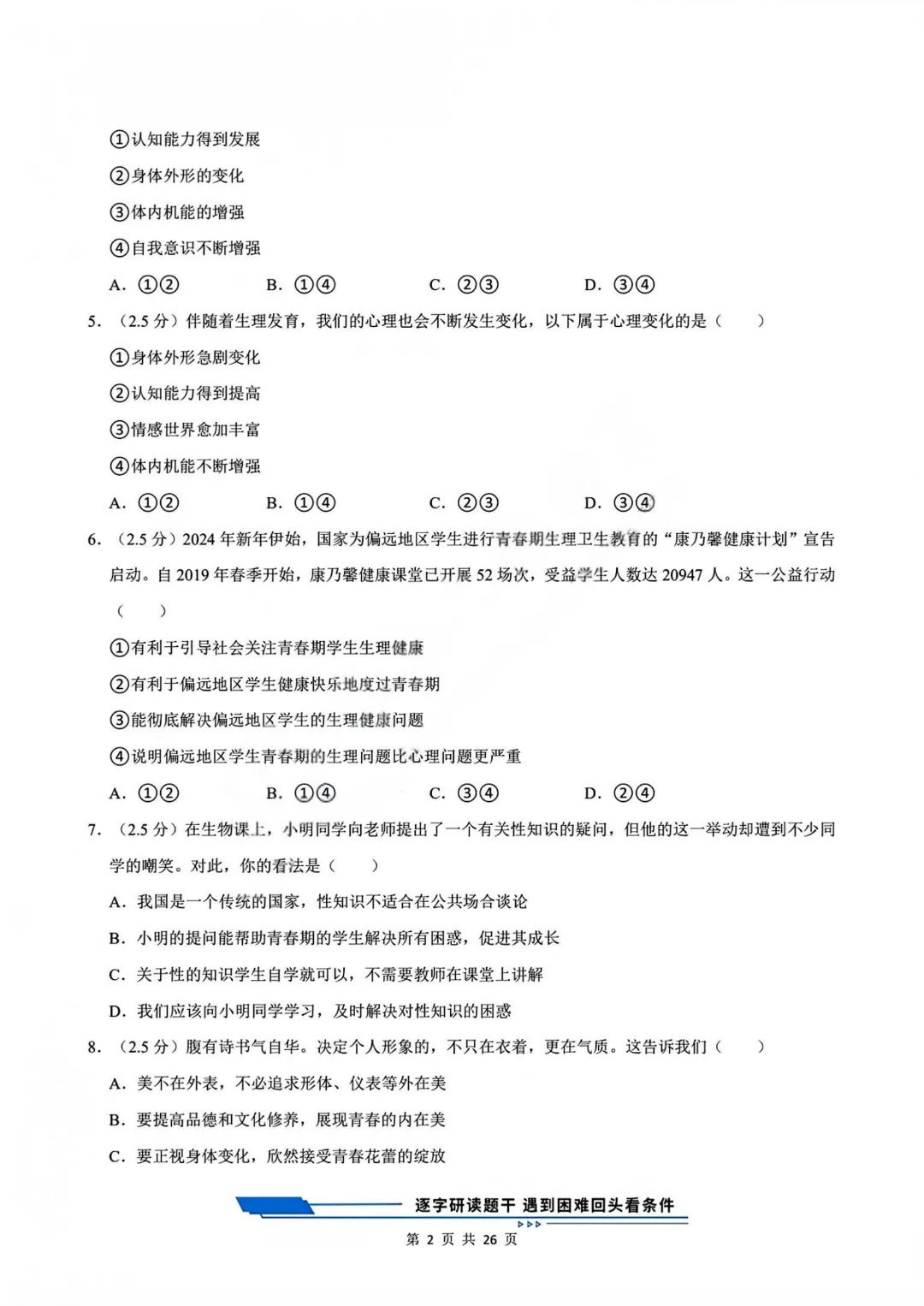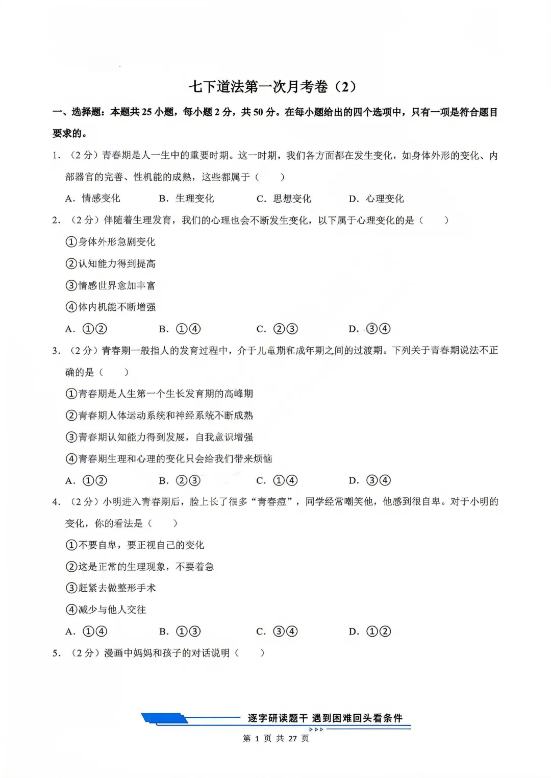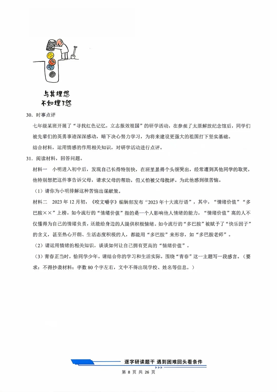 【七下道法】26年春七年级下册统编版道法《第一次月考测试卷3套》,可打印 · 点击蓝字,关注我们,加油新学期! 今天给大家分享的是:2025-2026学年七年级下册道法《第一次月考测试卷3套》含答案和解析,共79页,电子版可打印,可下载。这套七下道法第一次月考测试卷,帮助孩子检测这一阶段孩子知识点掌握情况,查漏补缺。需要的家长给孩子打印出来吧。 「领取完整电子版文档,请拉到文末 」 免费领取完整电子版: ①:点一点右下角的“👍”和“❤️” ②:在公众号对话框中回复:七年级 免责声明:本公众号所有资源分享仅供学习交流使用,公益分享,内容及图片均来自网络,如涉及侵权,请联系管理员删除。
