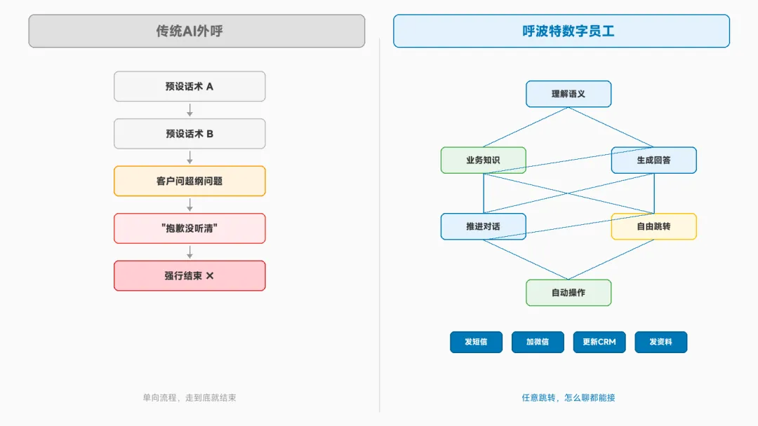 传统AI外呼是”匹配”——在预设答案里找最像的。