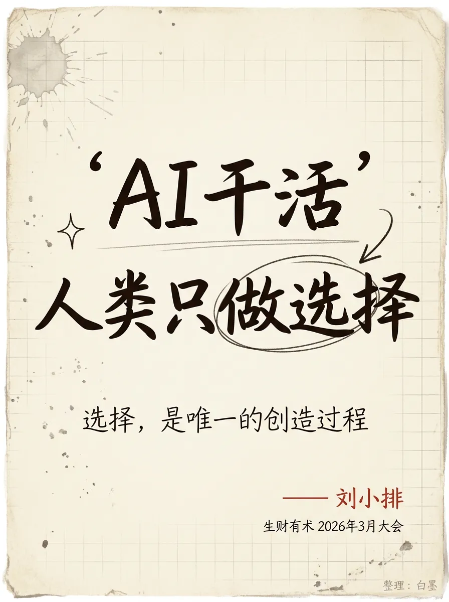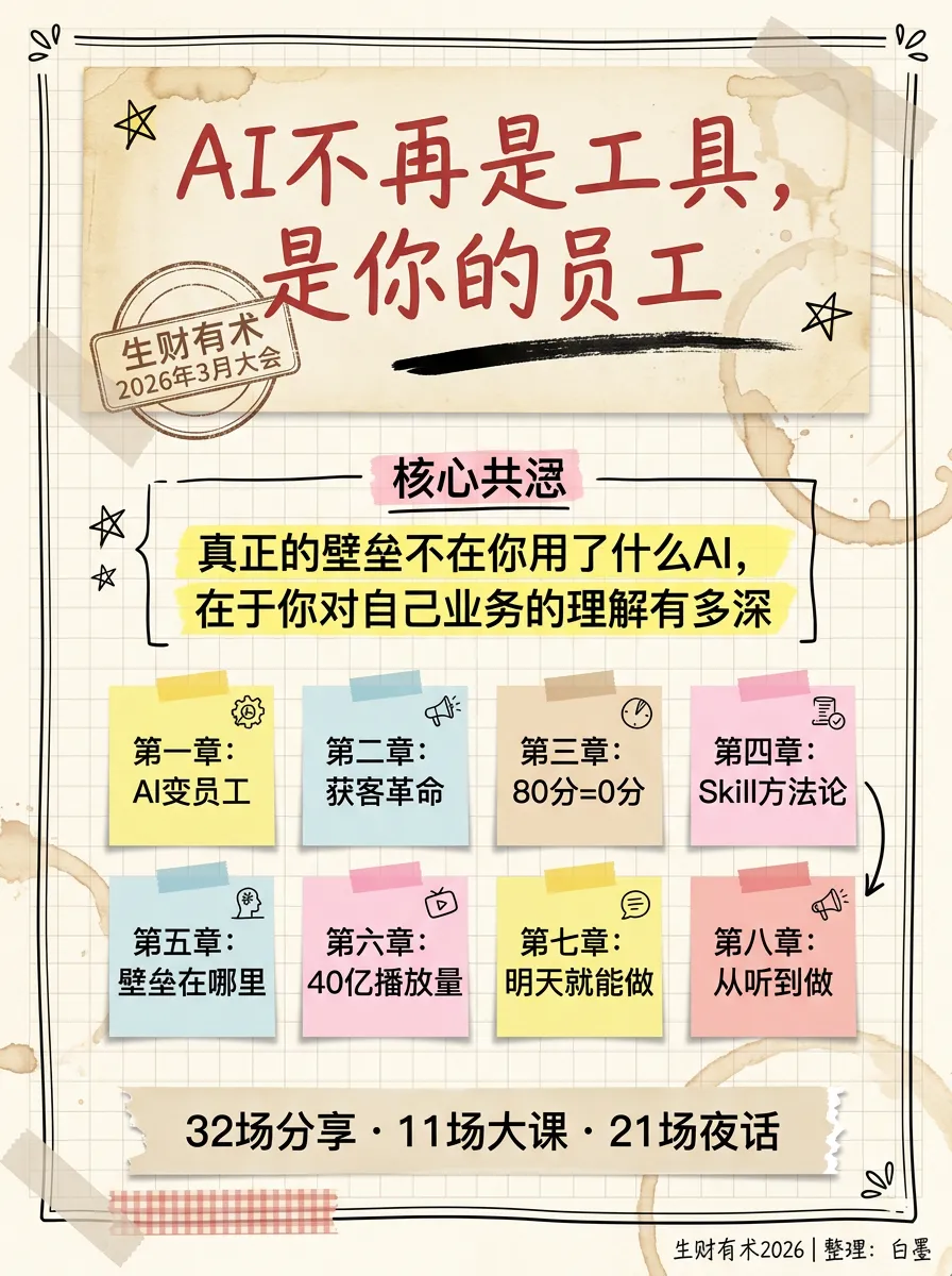 2026年3月底,生财有术在杭州办了一场两天的大会。11场白天大课,21场夜话,讲师来自你能想到的所有行业——做跨境电商年入一个亿的、做AI漫剧拿了4.3亿播放的、在飞书当产品经理运营了10万人龙虾社区的、开了130家火锅直营店的、靠搜索流量帮客户一个月赚350万的。